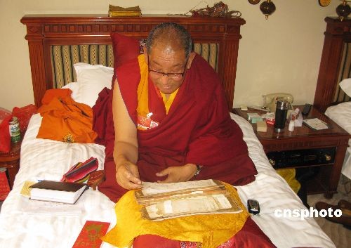 3月2日下午,赴北京出席全國“兩會”的政協委員、西藏林芝地區(qū)拉魯寺活佛洛桑·旦白尼瑪在所住賓館房間研讀會議材料。中新社發(fā) 張子揚 攝