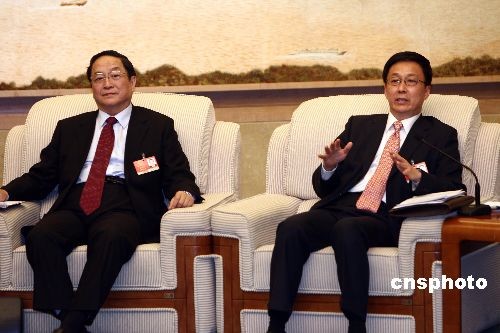 3月7日,全國(guó)人大上海代表團(tuán)在人民大會(huì)堂舉行全體會(huì)議。上海市委書記俞正聲(左)、市長(zhǎng)韓正出席會(huì)議。韓正在接受采訪時(shí)表示,已向國(guó)務(wù)院提交在上海成立人民幣結(jié)算試點(diǎn)申請(qǐng),希望能盡快推進(jìn)。中新社發(fā) 杜洋 攝