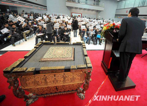 3月8日,“2008北京第29屆奧運會開幕式演出道具‘缶’專場拍賣會”在北京產(chǎn)權(quán)交易所落槌。首個標的共十個缶以1.3萬元總價起拍,經(jīng)過近百輪激烈競價,最終以70.6萬元被347號買家競得。據(jù)介紹,當日有1000只缶約53個標的投入競拍,共有439家單位和個人報名參與了現(xiàn)場競買,52名競買人以5244.7萬元的總價拍走1000個奧運缶,單個均價約5.2萬元,較0.11萬元的單個起拍均價而言,身價大增46倍。此次拍賣會創(chuàng)造了奧運物資拍賣歷史上拍賣持續(xù)時間最長、競買人最多、競價輪次最多、溢價率最高4個紀錄。