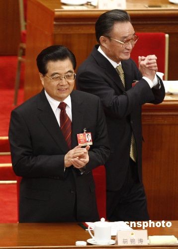 3月9日,十一屆全國人大二次會議在北京人民大會堂舉行第二次全體會議,圖為國家主席胡錦濤、全國人大常委會委員長吳邦國在主席臺就座。中新社發(fā) 盛佳鵬 攝