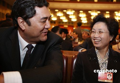 3月9日,十一屆全國(guó)人大二次會(huì)議第二次全體會(huì)議在北京人民大會(huì)堂舉行,剛剛利用大會(huì)休息日到天津考察鐵路建設(shè)的青海省女省長(zhǎng)宋秀巖,向鄰坐的新疆維吾爾自治區(qū)政府主席努爾·白克力請(qǐng)教鐵路建設(shè)的經(jīng)驗(yàn)。中新社發(fā) 任晨鳴 攝