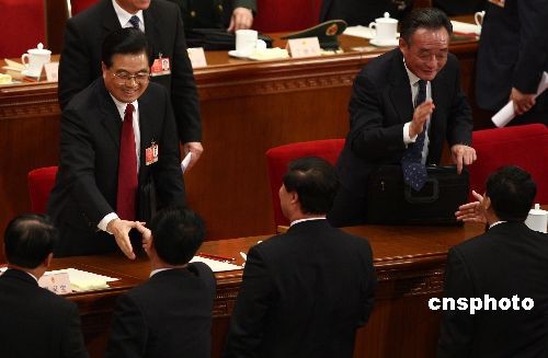 3月10日,中國國家主席胡錦濤、全國人大常委會(huì)委員長吳邦國在第十一屆全國人民代表大會(huì)第二次會(huì)議第三次全體會(huì)議結(jié)束后和代表握手。中新社發(fā) 杜洋 攝