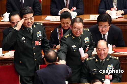 3月13日,第十一屆全國(guó)人民代表大會(huì)第二次會(huì)議在人民大會(huì)堂舉行閉幕會(huì),解放軍代表在主席臺(tái)上互致問候。中新社發(fā) 杜洋 攝