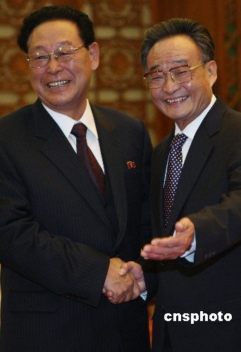 3月19日下午,中國全國人大常委會委員長吳邦國在北京人民大會堂會見朝鮮民主主義人民共和國內閣總理金英日。中新社發(fā) 任晨鳴 攝