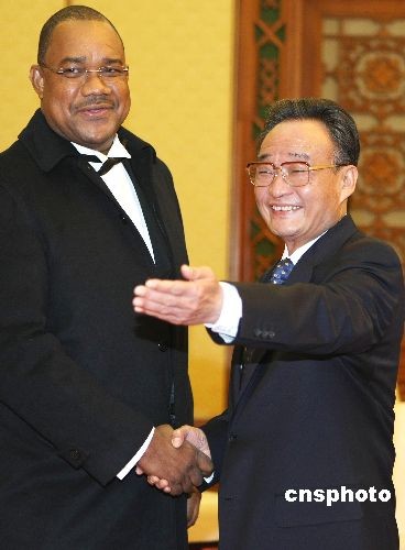 3月23日下午,中國全國人大常委會委員長吳邦國在北京人民大會堂會見來訪的塞舌爾國民議會議長帕特里克·赫米尼耶一行。中新社發(fā) 任晨鳴 攝