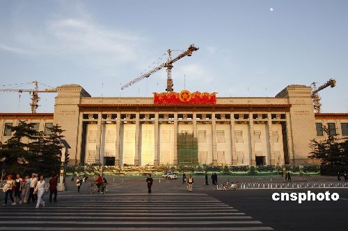 4月6日,中國(guó)國(guó)家博物館西門前罩上了綠色圍擋,工作人員正在加緊搭建上海世博會(huì)倒計(jì)時(shí)牌。據(jù)悉,該倒計(jì)時(shí)牌將于2009年5月1日上海世博會(huì)倒計(jì)時(shí)一周年之際正式亮相。全國(guó)政協(xié)常委、上海世博會(huì)執(zhí)委會(huì)執(zhí)行主任萬(wàn)季飛在“兩會(huì)”期間表示,上海世博會(huì)將于明年5月1日開(kāi)幕,在倒計(jì)時(shí)一周年之際,組委會(huì)將于今年5月1日在天安門廣場(chǎng)和國(guó)家博物館西門前豎立上海世博會(huì)倒計(jì)時(shí)牌,7月5日到15日將在首都博物館舉辦走進(jìn)世博會(huì)大型巡展。中新社發(fā) 鄭雄增 攝