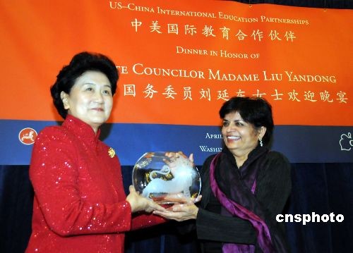 正在美國訪問的國務(wù)委員劉延?xùn)|當(dāng)?shù)貢r間十六日晚出席了美亞洲協(xié)會和大學(xué)理事會聯(lián)合舉辦的晚宴,就中美關(guān)系和兩國人文交流發(fā)表講話。美亞洲協(xié)會和大學(xué)理事會還分別向劉延?xùn)|頒發(fā)各自的最高榮譽獎。圖為美國亞洲協(xié)會會長丁文嘉向劉延?xùn)|頒發(fā)該會最高榮譽獎。中新社發(fā) 吳慶才 攝