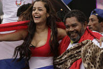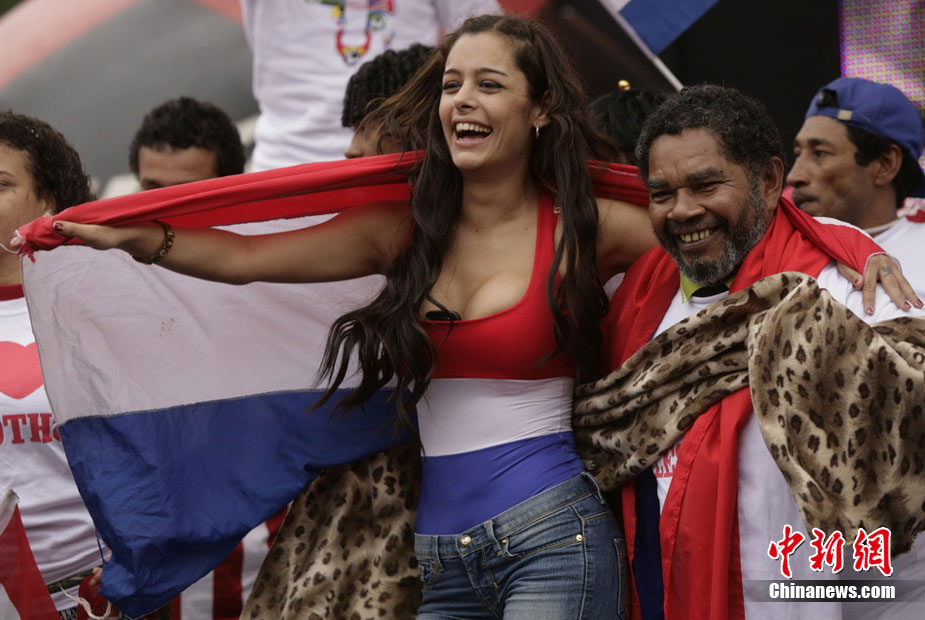 6月29日,巴拉圭點(diǎn)球大戰(zhàn)5-3擊敗日本。著名乳神女球迷拉里薩再度胸夾手機(jī)亮相,并與日本球迷同樂,瘋狂慶祝盡顯激情狂野。