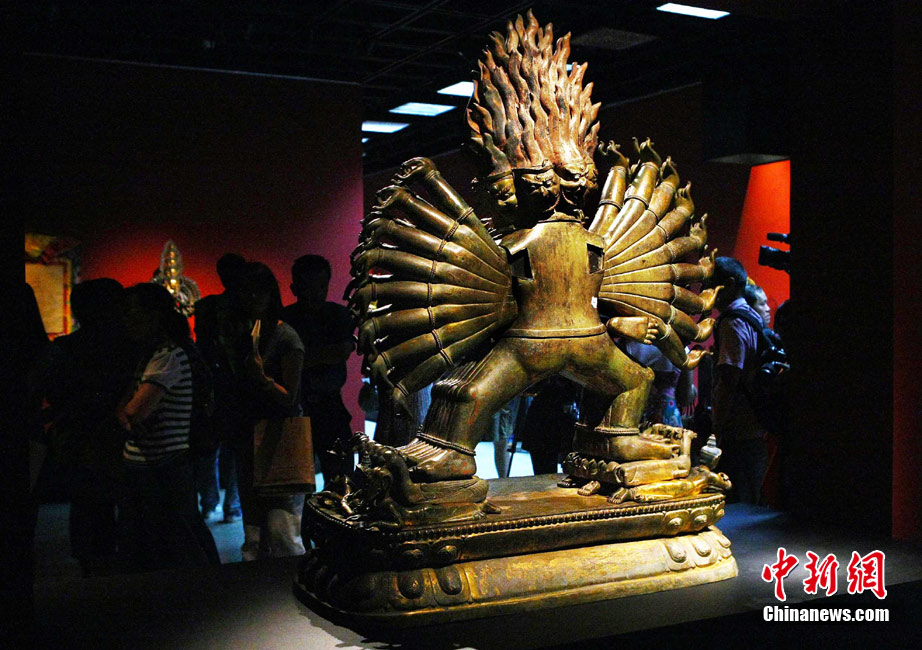 “圣地西藏---最接近天空的寶藏”特展,6月30日在臺(tái)灣故宮博物院揭開(kāi)面紗。這次展覽是臺(tái)灣歷年來(lái)規(guī)格最高、面向最完整的西藏文化與文物展,展出的130組件文物,來(lái)自西藏布達(dá)拉宮、羅布林卡等寺廟、西藏博物館、承德避暑山莊和北京民族文化宮等12處文物重鎮(zhèn)。整個(gè)展覽按“吐蕃王朝”、“金色寶藏”、“文化交流”、“雪域風(fēng)情”四部分布局展出,展覽9月19日結(jié)束。中新社記者 宋吉河攝
