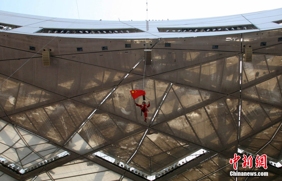 7月2日,在鳥巢上空艱難生活60天之后,高空王子阿迪力告別鳥巢回到地面,同時(shí)創(chuàng)造了60天累計(jì)連續(xù)走綱絲時(shí)間最長吉尼斯世界紀(jì)錄。圖為阿迪力用吊威亞的方式回到地面。中新社發(fā) 富田 攝