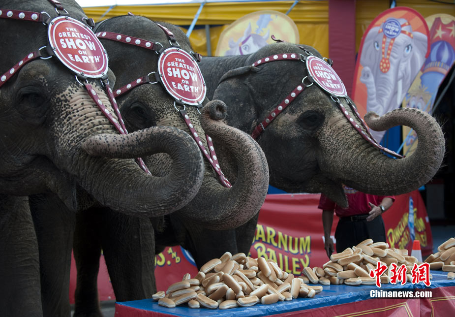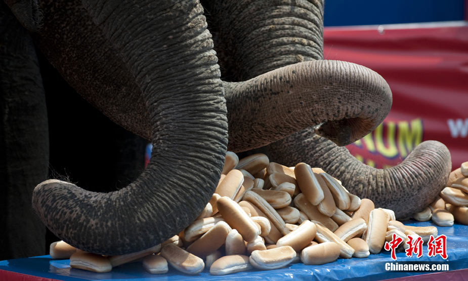當(dāng)?shù)貢r(shí)間7月2日,在美國紐約的科尼島,一支由三只大象組成的“隊(duì)伍”和三位大胃王進(jìn)行了一次吃面包PK。最終大象隊(duì)獲得了勝利。