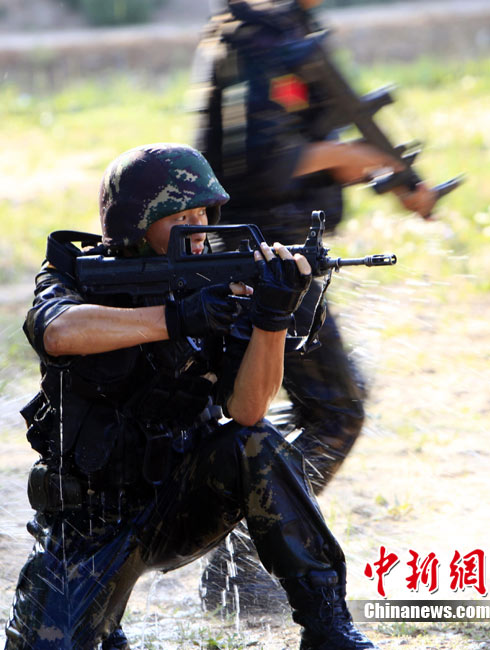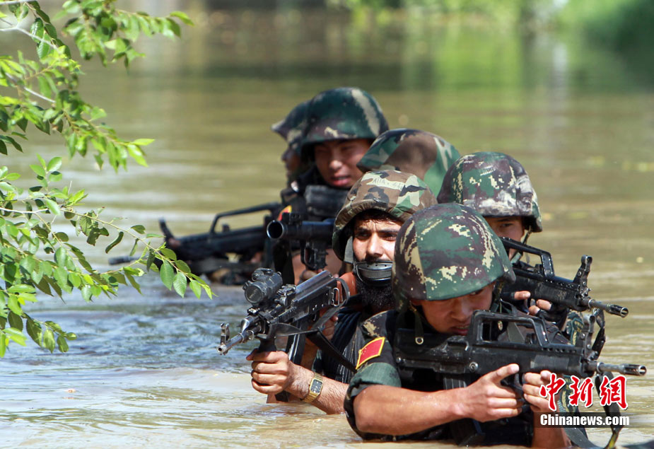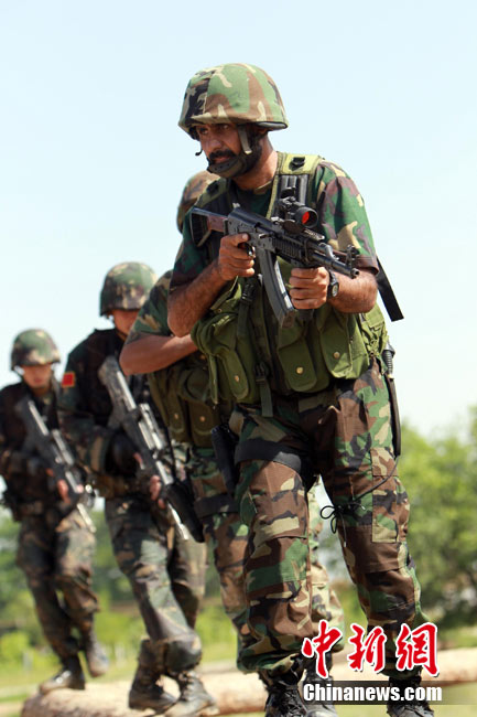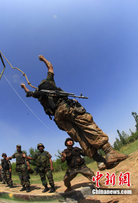 7月5日,中巴兩軍特戰(zhàn)士兵展開(kāi)高強(qiáng)度魔鬼訓(xùn)練。此次代號(hào)為“友誼—2010”的中國(guó)巴基斯坦反恐聯(lián)合訓(xùn)練在中國(guó)寧夏青銅峽地區(qū)展開(kāi),訓(xùn)練主要以邊境地區(qū)山地聯(lián)合反恐作戰(zhàn)為課題,分為展示交流、混編同訓(xùn)、綜合演練三個(gè)階段。 中新社發(fā) 杜洋 攝
