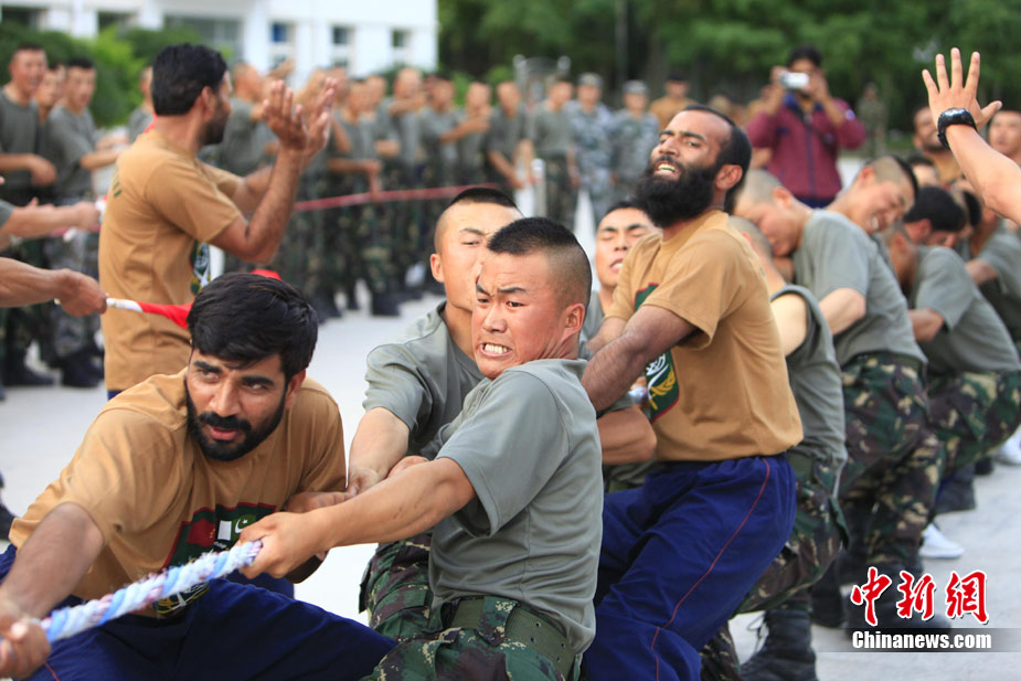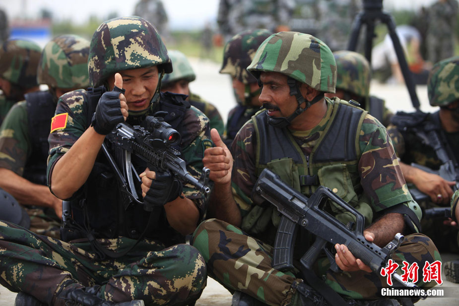 7月初,代號“友誼—2010”的中國巴基斯坦反恐聯(lián)合訓(xùn)練在中國寧夏青銅峽地區(qū)展開,此次訓(xùn)練主要以邊境地區(qū)山地聯(lián)合反恐作戰(zhàn)為課題。開訓(xùn)以來,參訓(xùn)官兵每天不論是訓(xùn)練交流還是開展文體活動,都混編為A連和B連為單位組織實施,盡管語言溝通并不暢通,但中巴兩國士兵在手勢和眼神的幫助下,依然能夠協(xié)作訓(xùn)練默契自然,完成動作標(biāo)準(zhǔn)規(guī)范。中新社發(fā) 杜洋 攝