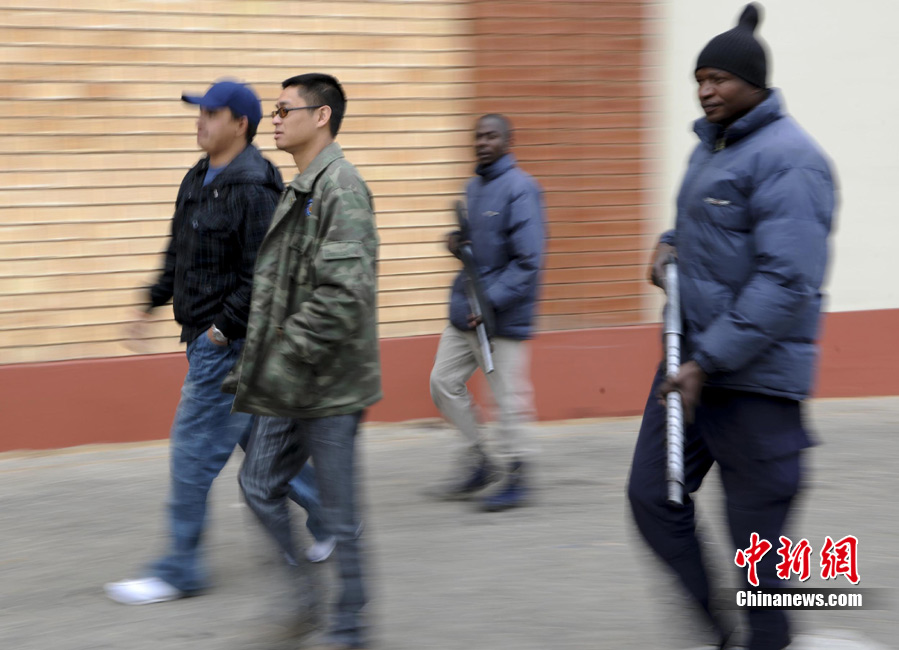 南非華人安保公司總經(jīng)理謝宇航與南非當?shù)貑T工持槍在約翰內(nèi)斯堡中國商貿(mào)城內(nèi)巡邏。約翰內(nèi)斯堡被稱為全世界最危險的城市之一。世界杯期間,南非的這種保安公司不僅受雇為球隊做保鏢,而且在警力不足的情況下,許多保安公司受雇于警方,成為保衛(wèi)世界杯安全的一支重要力量。而南非華人安保公司也是其中之一,他們的主要服務對象是位于約翰內(nèi)斯堡核心城區(qū)的中國商貿(mào)城。中新社發(fā) 廖攀 攝