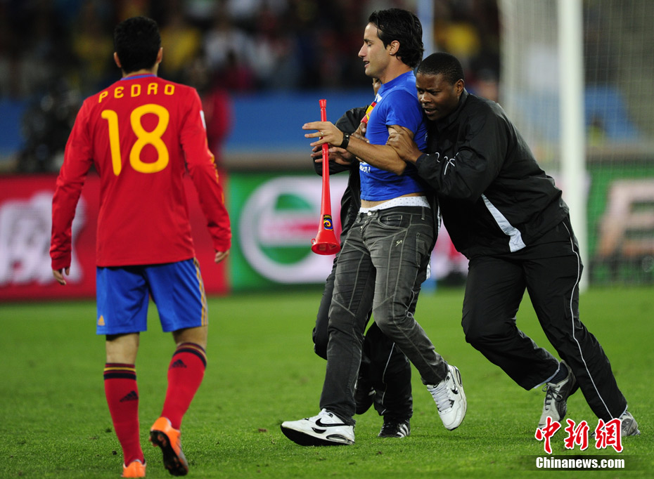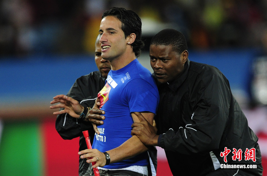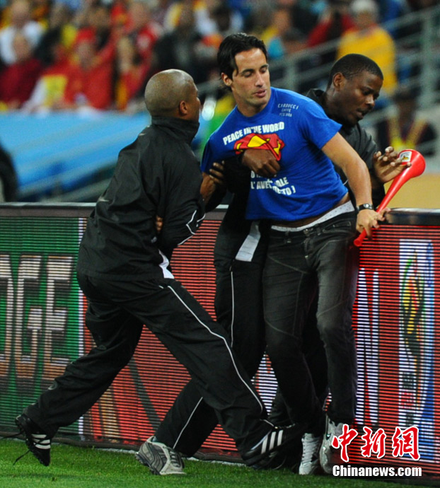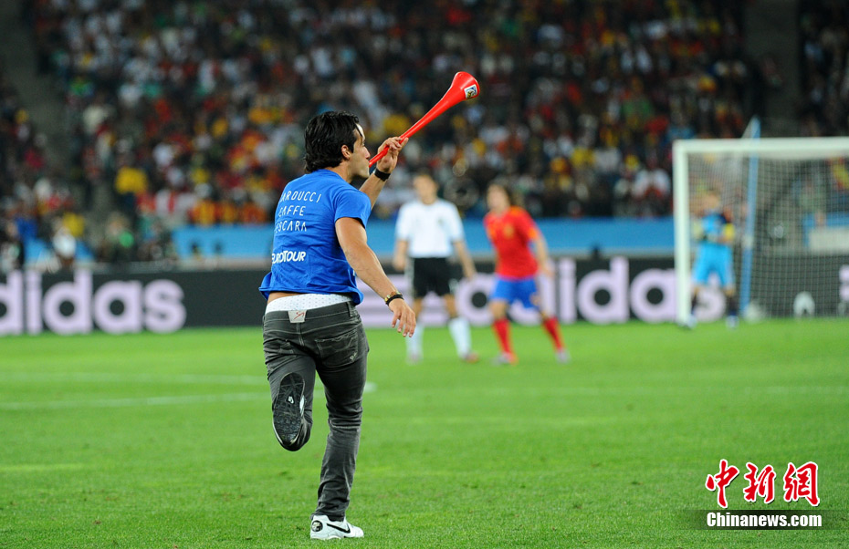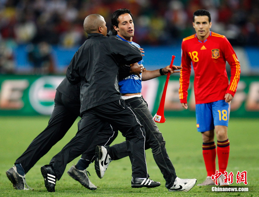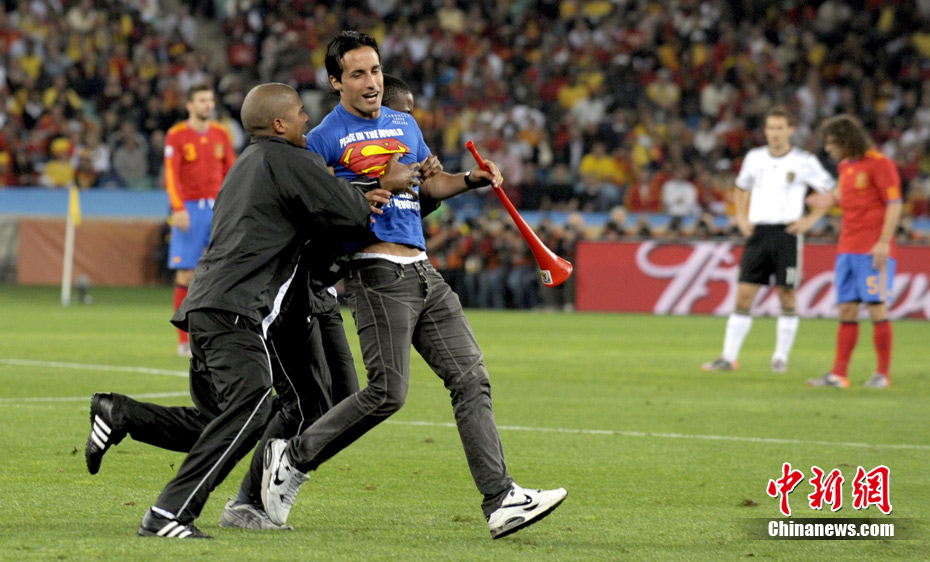 西班牙隊(duì)和德國(guó)隊(duì)激戰(zhàn)正酣時(shí)。一名球迷身穿超人背心突然闖進(jìn)球場(chǎng),此時(shí)雙方的比賽短暫地暫停了一會(huì)兒,球迷被保安推出了球場(chǎng)。后經(jīng)有關(guān)部門(mén)證實(shí),這是一名意大利球迷。