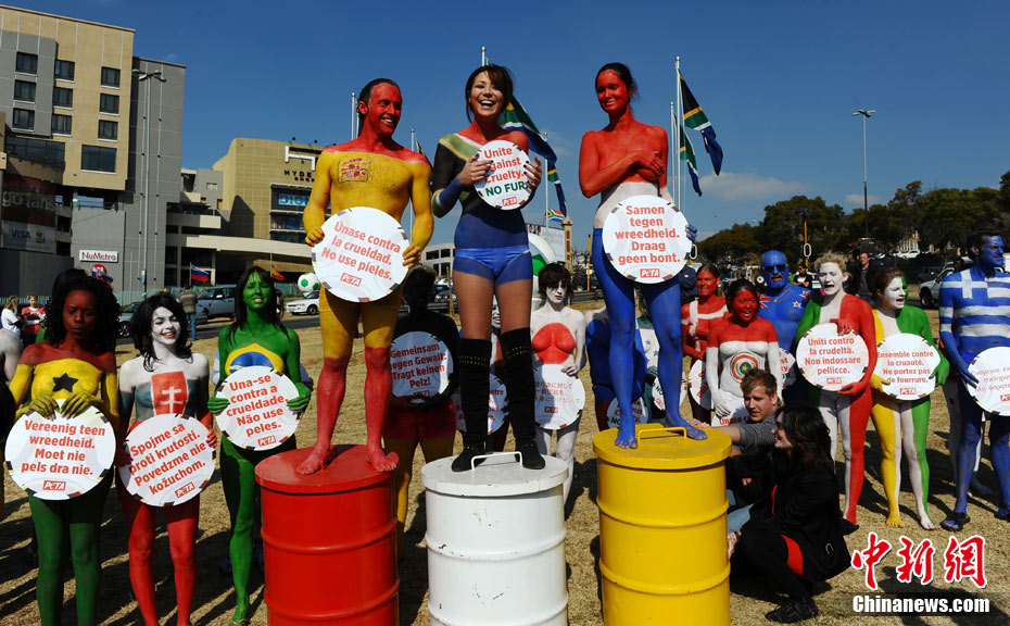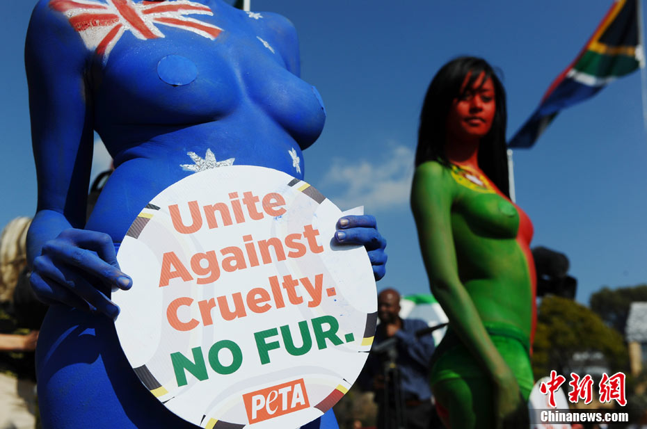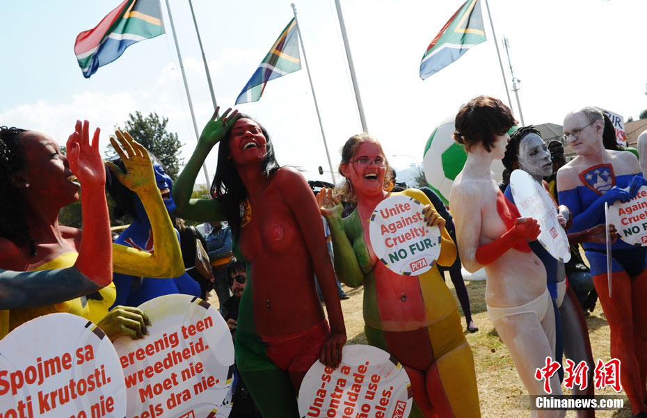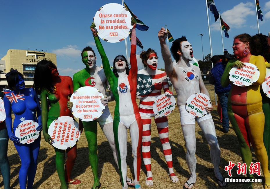 7月8日,南非世界杯賽場外,善待動物組織(PETA)舉行彩繪游行。參與者身體上畫各國的國旗,并舉著寫有“團結(jié)起來 抗議使用皮草”的標語牌。