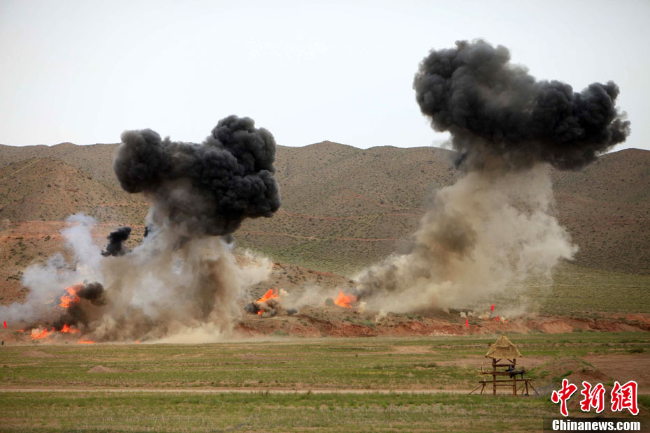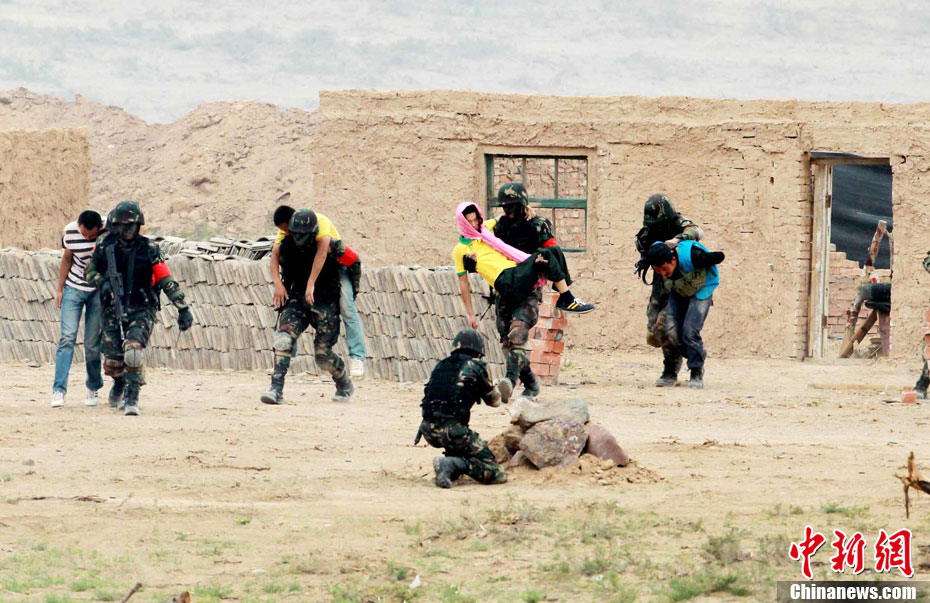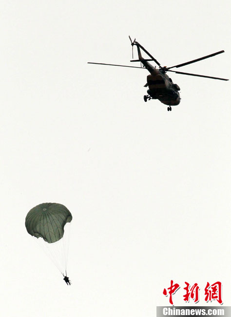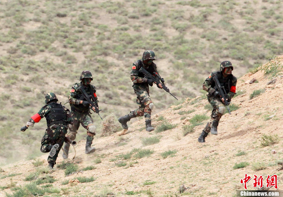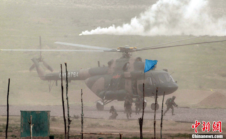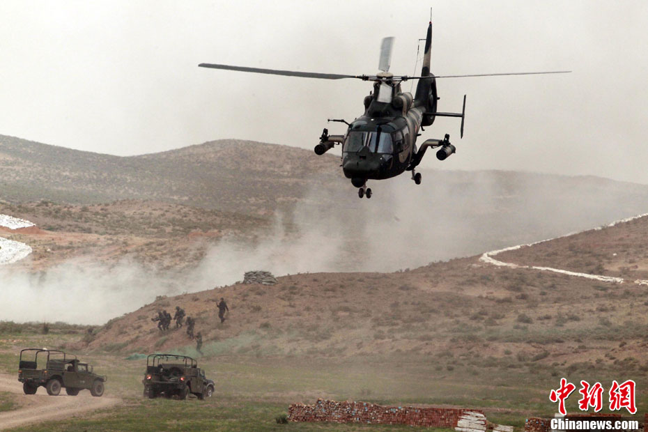 7月9日,友誼-2010”中巴反恐聯(lián)訓在蘭州軍區(qū)某訓練基地舉行實兵實彈演練,演練設計的背景是,對潛入中巴邊境地區(qū)實施襲擊破壞的國際恐怖分子進行聯(lián)合打擊。圍繞“邊境地區(qū)山地聯(lián)合反恐作戰(zhàn)”這一課題,演練了遠程投送、偵察監(jiān)視、立體封控、精確打擊、解救人質(zhì)、搜剿圍殲6個行動。這次反恐聯(lián)演的一個亮點,就是首次空地協(xié)同,聯(lián)合打擊,由地面反恐特戰(zhàn)人員引導殲轟機、武裝直升機實施空中火力突擊,采取精打要害的戰(zhàn)法,以建制內(nèi)的火器對恐怖分子營地重要目標實施火力打擊。中新社發(fā) 杜洋 攝