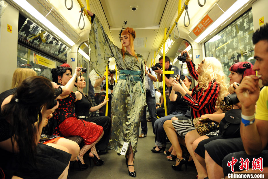 近日,模特穿行在德國柏林行駛的地鐵上進(jìn)行時裝表演。這場名為“地鐵上的貓步”的時裝表演充滿朋克和搖滾元素,已經(jīng)成為每年柏林春夏時裝周的一部分。