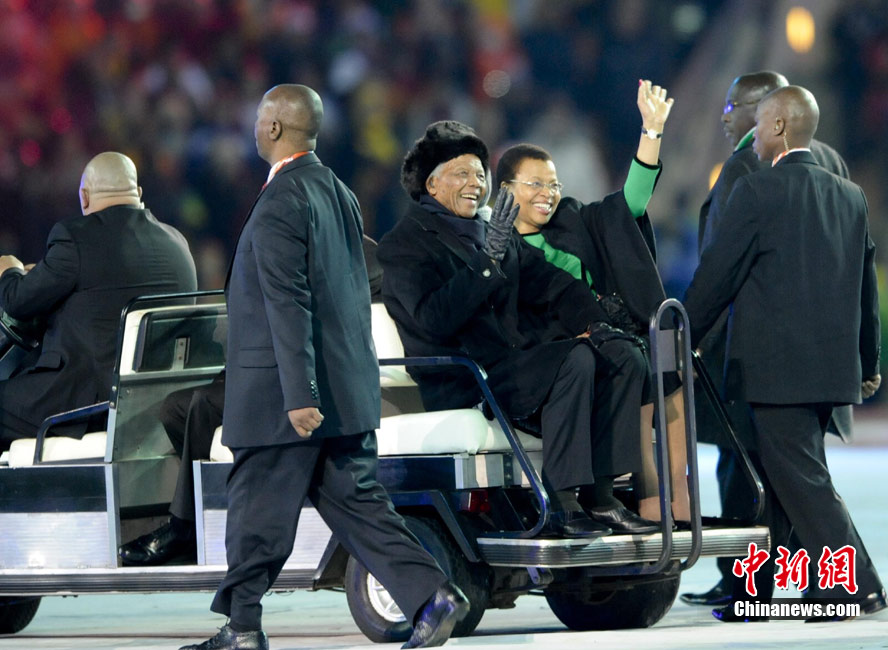 北京時間7月12日凌晨0:45,南非世界杯閉幕式拉開帷幕,在這場兼具活力和高科技的精彩表演中,洋溢著濃郁的非洲風(fēng)情,成為即將在2:30打響的荷蘭與西班牙決賽的最好墊場戲。圖為南非前總統(tǒng)納爾遜曼德拉出席閉幕式。中新社記者 廖攀 攝