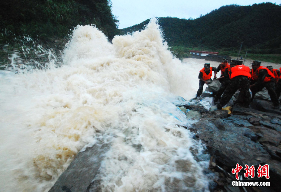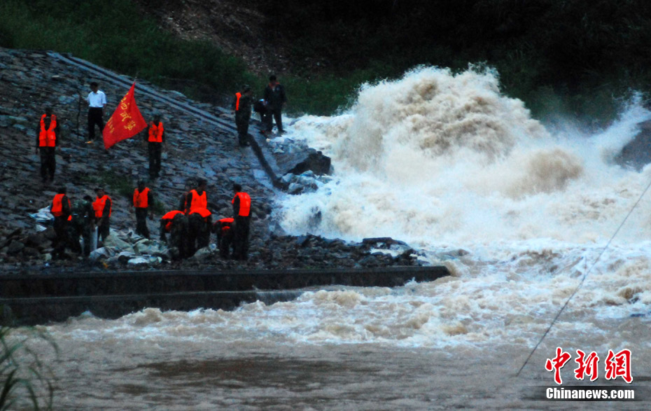 中新網(wǎng)都昌7月14日電(胡國林)14日,受強降雨襲擊,江西九江市都昌大港鎮(zhèn)梅溪水庫水位超過泄洪道1米左右,啟閉設備出現(xiàn)失靈,洪水如猛獸般狂瀉入下,部分村莊和數(shù)千畝農(nóng)田被淹。 險情發(fā)生后,當?shù)胤姥床块T立即組織抗洪搶險突擊隊,武警官兵和當?shù)厝罕娒爸kU,拋石加固堤壩,防止洪庫潰堤,下游數(shù)千名村民已被安全轉(zhuǎn)移。