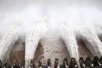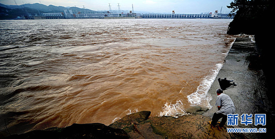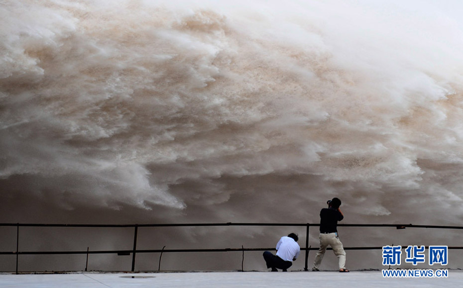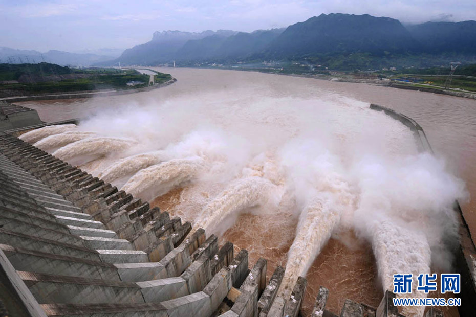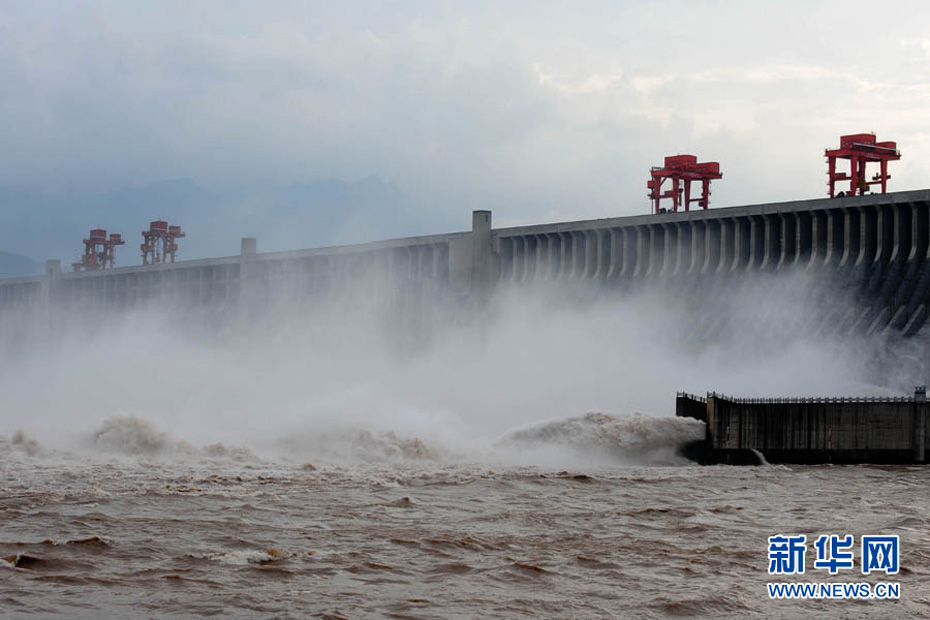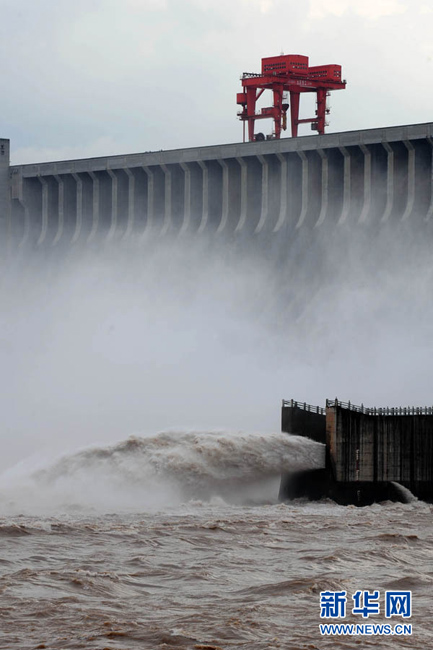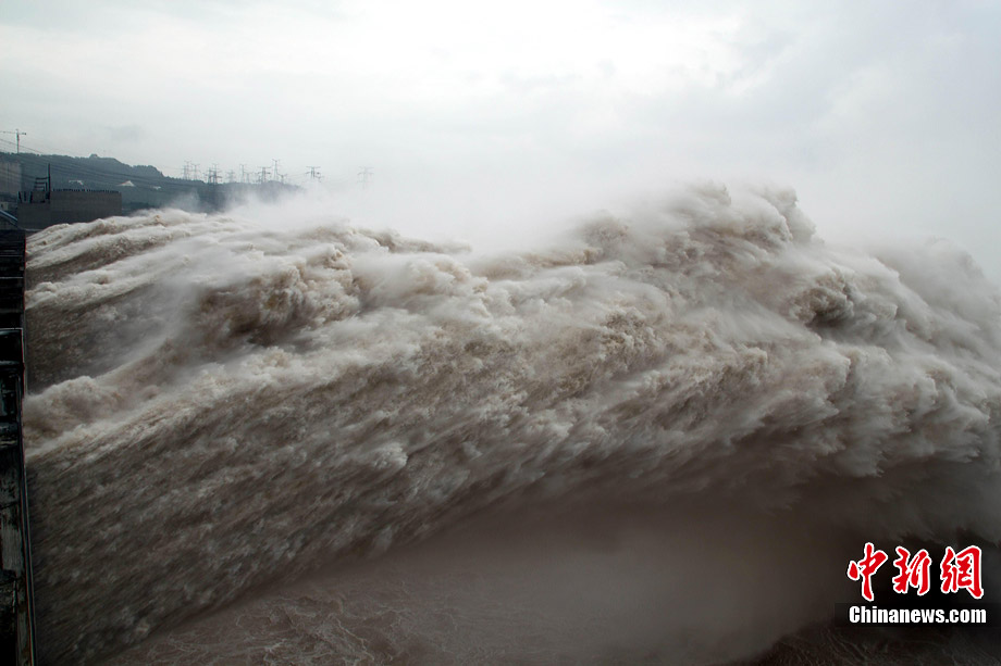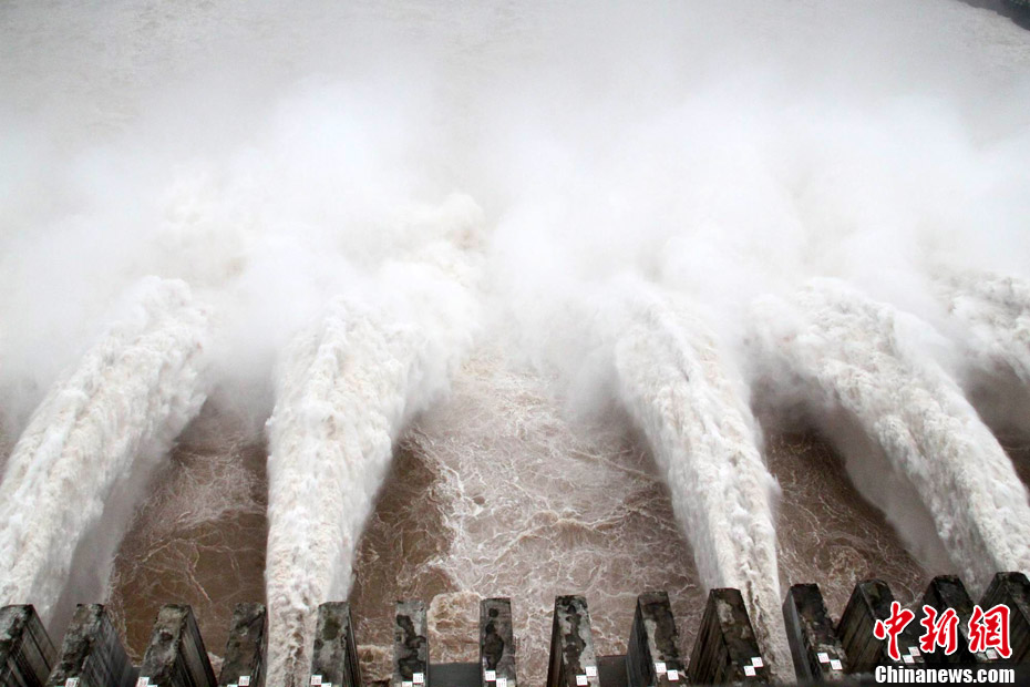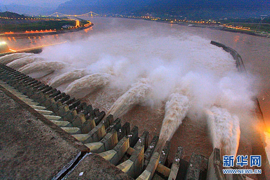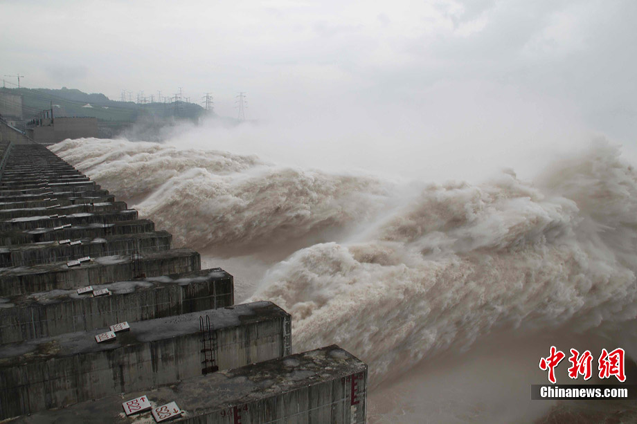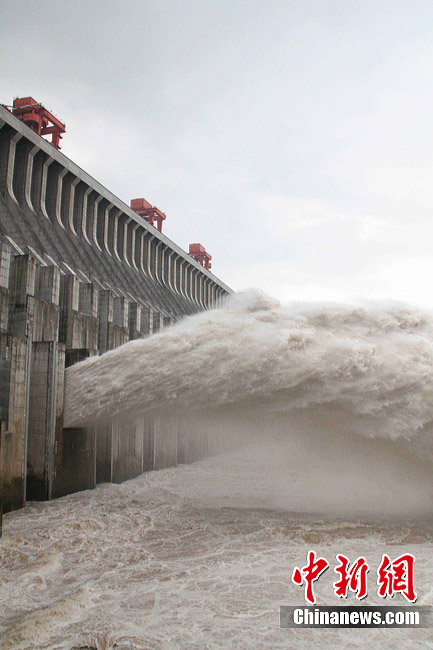 7月20日8時(shí),峰值為7萬(wàn)立方米/秒的洪水抵達(dá)三峽大壩。這是三峽工程建成后的首次大規(guī)模洪峰。大壩共開啟9個(gè)泄洪深孔,將洪水下泄流量控制在4萬(wàn)立方米/秒左右,削減了4成多的洪峰下泄流量。中新社發(fā) 劉良偉 攝