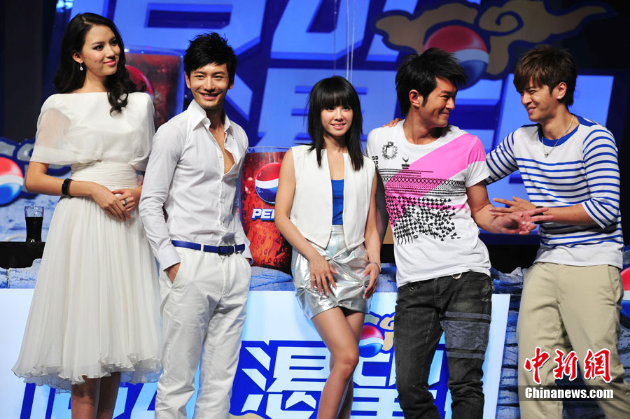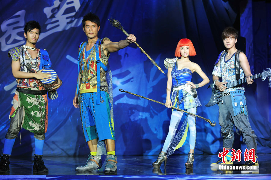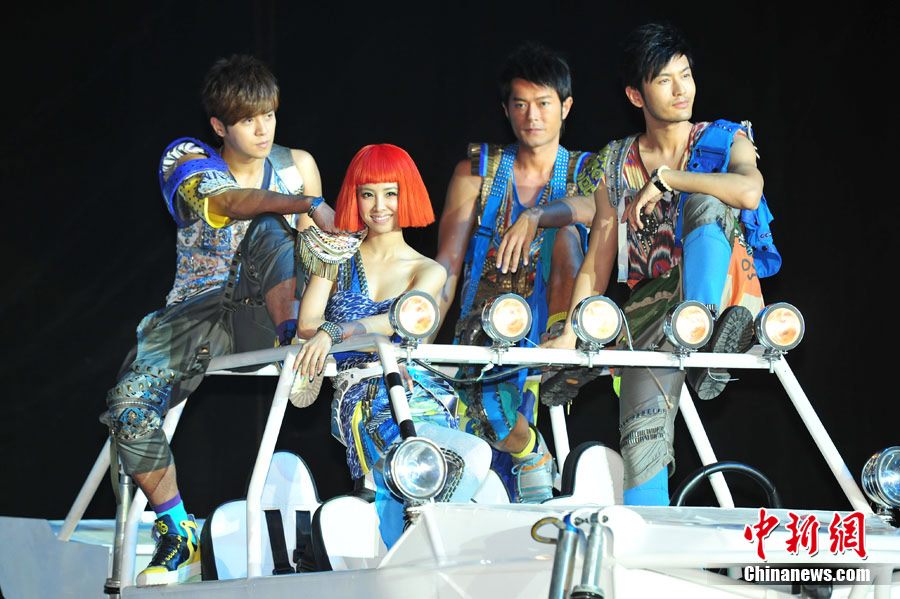 7月21日,國際某飲料巨頭在北京召開新聞發(fā)布會,最新主題廣告震撼首播。古天樂、羅志祥、黃曉明、蔡依林身著華麗戰(zhàn)袍駕駛戰(zhàn)車亮相,他們以師兄弟的身份打造全新“西游記”,“世界小姐選美大賽冠軍”張梓琳更是以蜘蛛精身份出演。中新社記者 富田 李學(xué)仕 攝