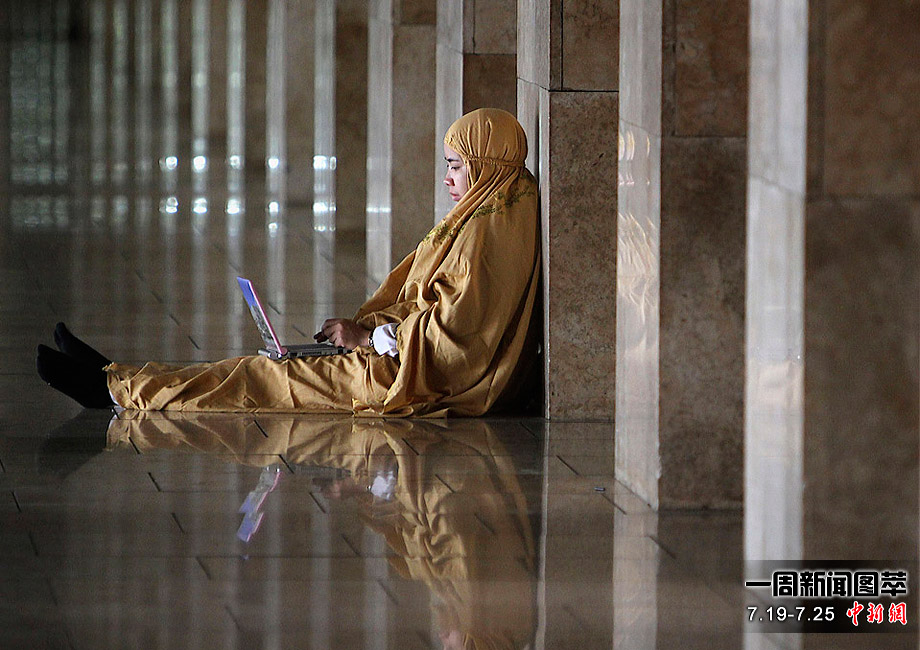 周一(19日),一名印尼穆斯林婦女在雅加達Istiglal清真寺做完午后禱告后用她的筆記本電腦工作。