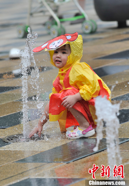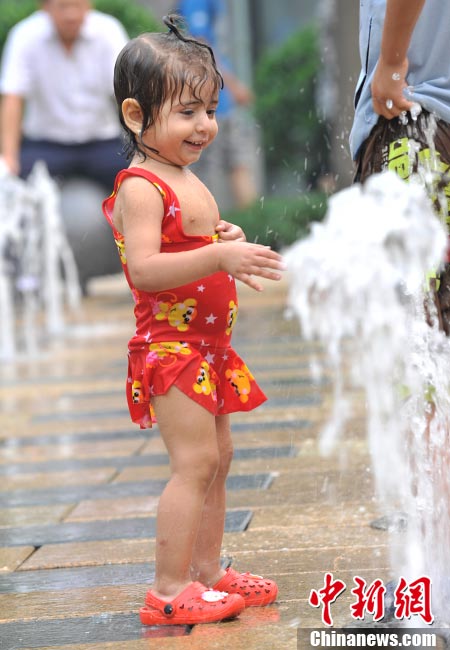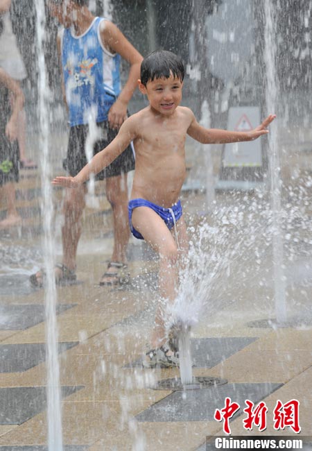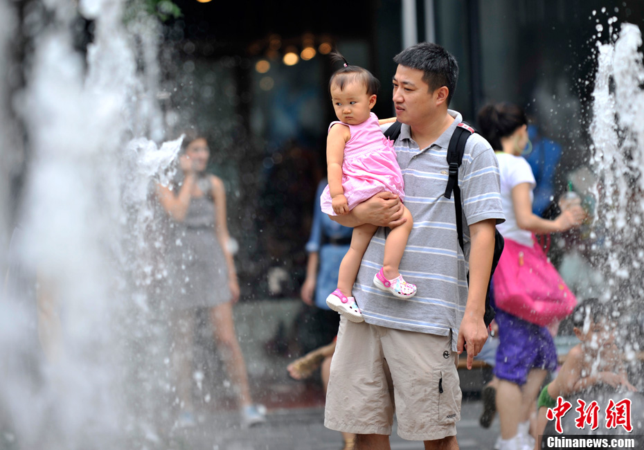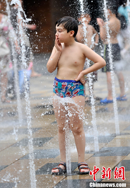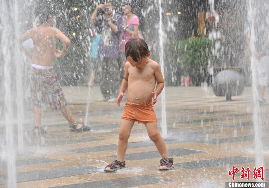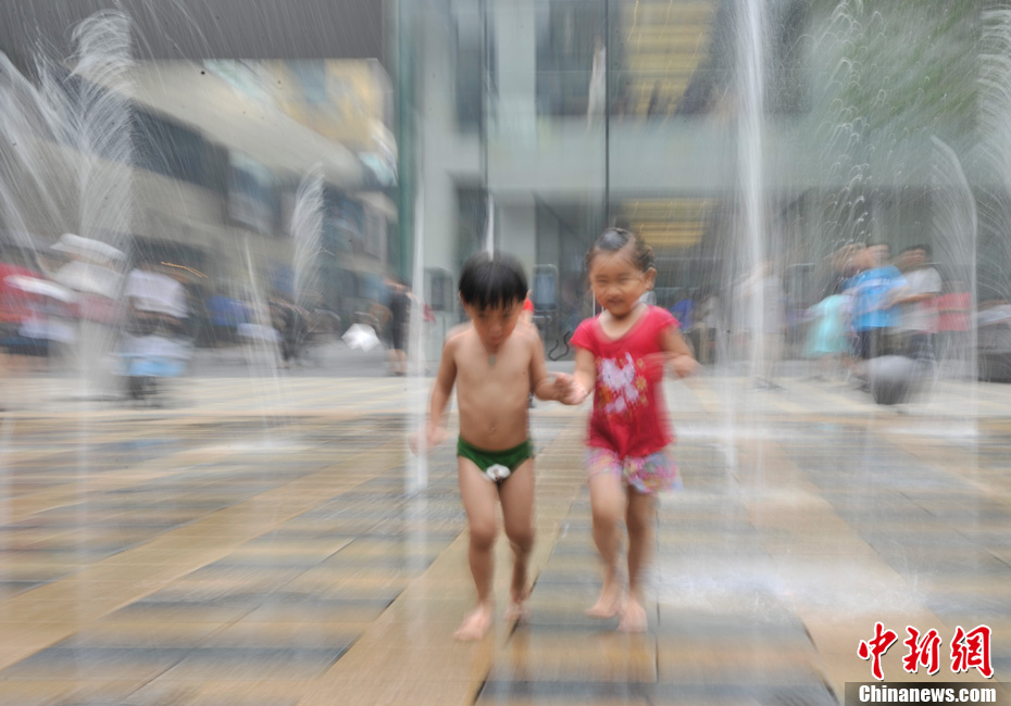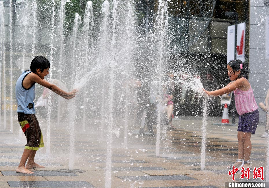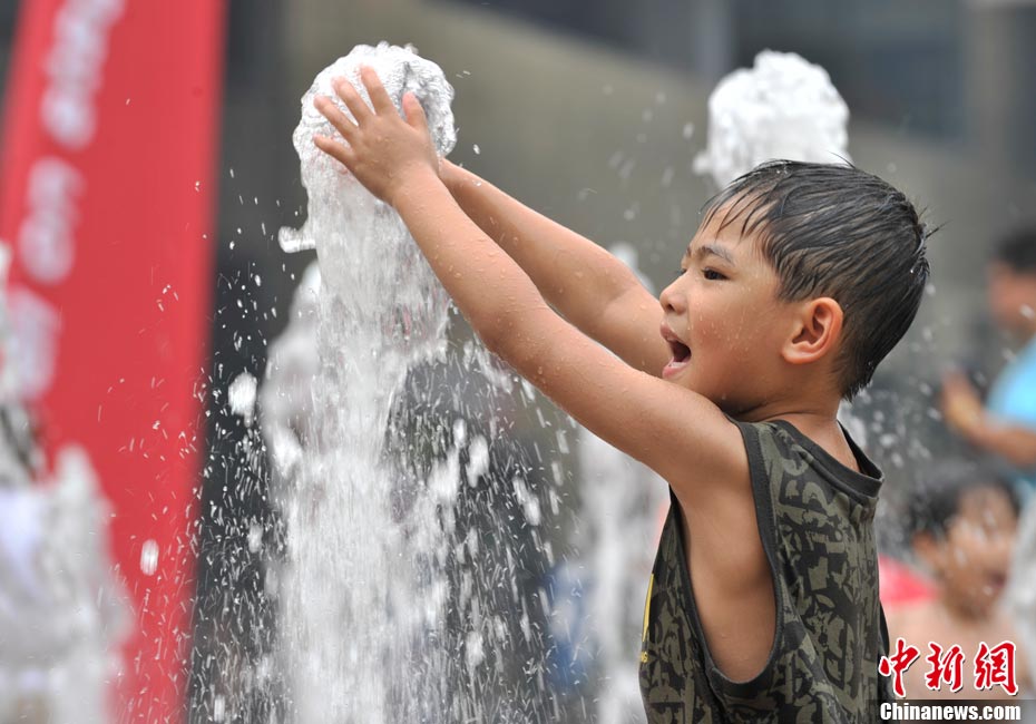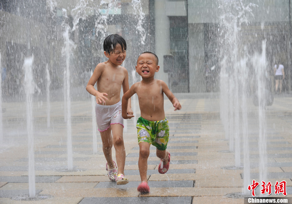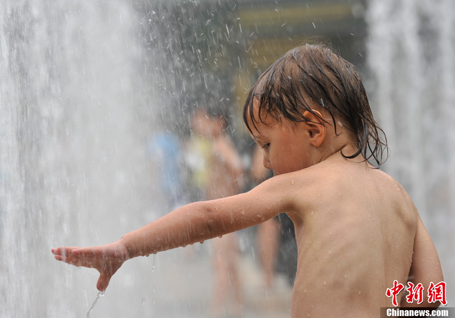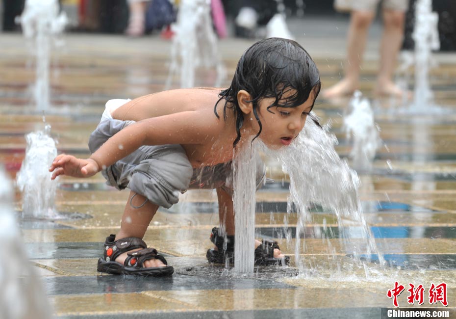 近日,北京持續(xù)的高溫使“桑拿天”的感覺越來越強(qiáng)烈。中央氣象臺繼續(xù)發(fā)布高溫藍(lán)色預(yù)警,預(yù)計(jì)未來三天,新疆吐魯番盆地和南疆盆地、甘肅西部、內(nèi)蒙古大部有35-37℃的高溫天氣,新疆吐魯番盆地、內(nèi)蒙古中西部的部分地區(qū)最高氣溫可達(dá)42℃以上;陜西東北部、山西北部、河北中西部、北京大部、天津西部、重慶大部、江南中西部等地有35℃以上的高溫天氣,局地最高氣溫可達(dá)37~38℃。圖為7月26日北京三里屯一處噴泉引來許多中外小朋友戲水享清涼。中新網(wǎng)記者 金碩 攝