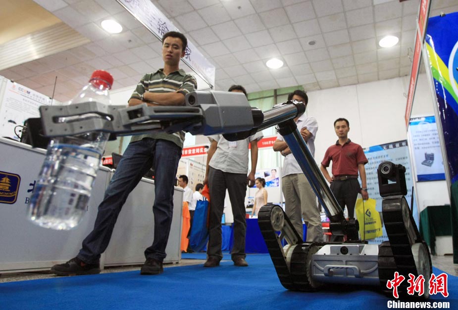 8月4日,2010新疆警用技術(shù)裝備暨社會公共安全產(chǎn)品博覽會(簡稱安博會)在烏魯木齊開幕,一部新型排爆機器人亮相本屆安博會,現(xiàn)場抓起礦泉水瓶。據(jù)了解,本屆安博會吸引了來自美國、英國、意大利等國家和地區(qū)的安保設(shè)備生產(chǎn)企業(yè)前來參展,并匯集大批警用應(yīng)急指揮車、防爆摩托車、槍支武器、坦克車、智能機器人等平日不常見到的警用技術(shù)裝備,成為安博會開辦以來規(guī)模最大、參展產(chǎn)品最多樣的一次盛會,令到場參觀民眾大開眼界。中新社發(fā) 劉新 攝