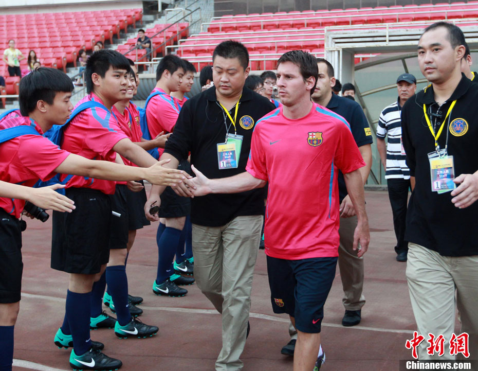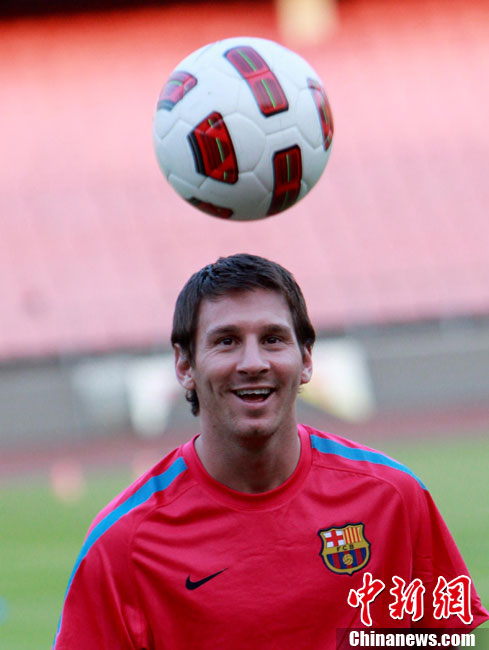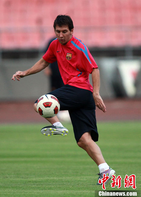 8月6日,巴塞羅那俱樂部在北京工人體育館進行了第二次公開訓練課,眾多巴薩球迷也在現場目睹了球隊風采。圖為梅西出場表情輕松。中新社發(fā) 杜洋 攝