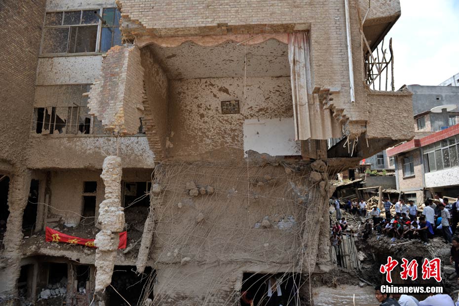 舟曲縣城內(nèi)被泥石流沖毀的建筑。中新網(wǎng)記者 金碩 攝