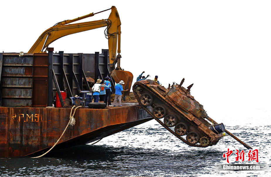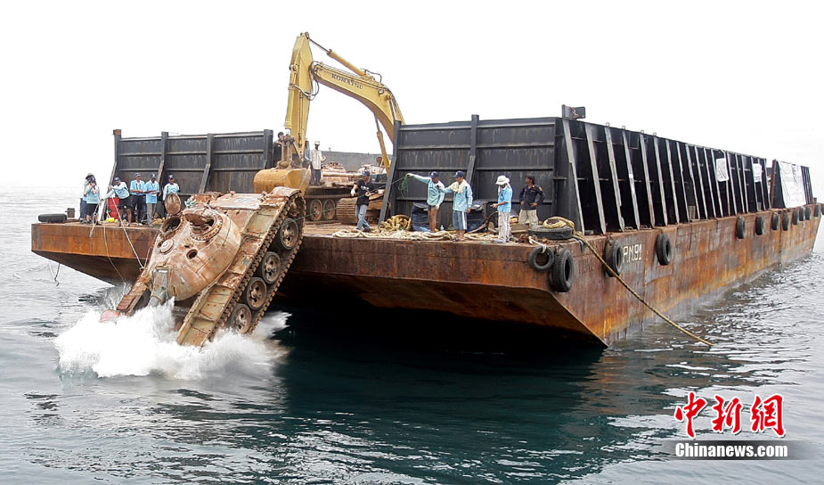8月9日,泰國(guó)政府將25輛軍隊(duì)廢棄坦克連同一些卡車(chē)丟進(jìn)大海,目的是形成一些固定的水下建筑結(jié)構(gòu),為海洋生物提供庇護(hù)場(chǎng)所,刺激本地魚(yú)類(lèi)種群的繁殖。