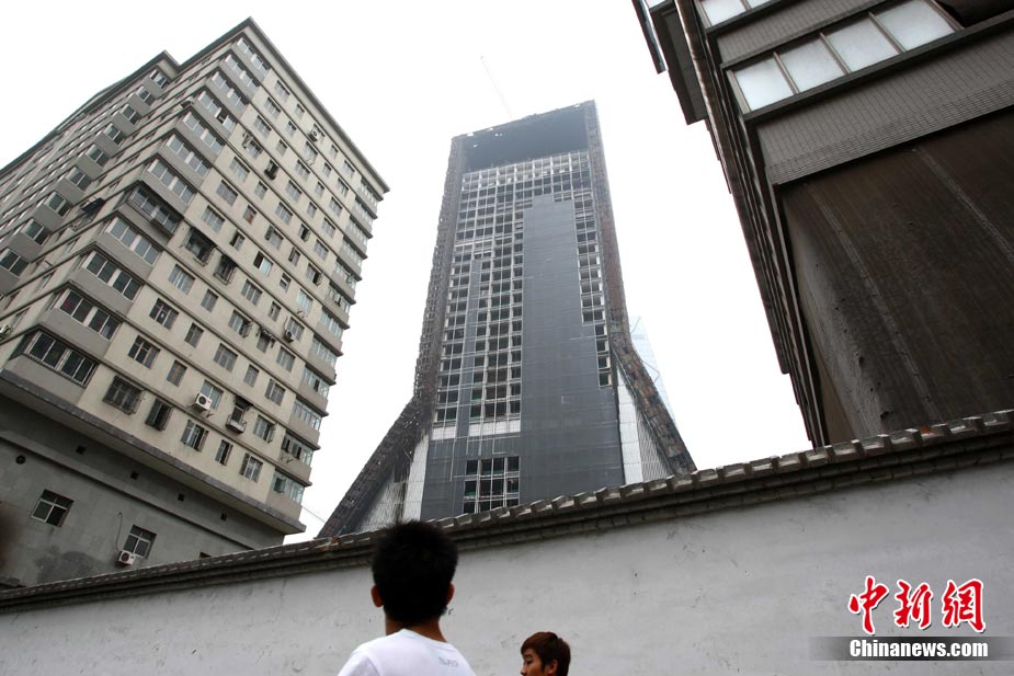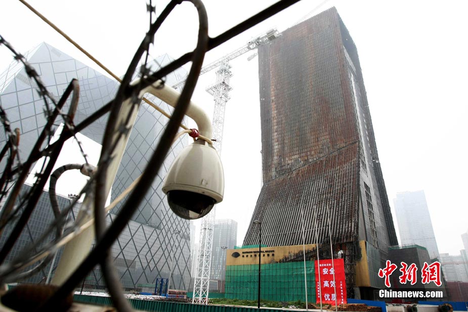 8月11日,中央電視臺(tái)電視文化中心工程(北配樓)拆卸復(fù)建施工正式啟動(dòng)。據(jù)了解,當(dāng)日啟動(dòng)的是金屬幕墻和網(wǎng)架的拆卸。由于主題結(jié)構(gòu)未受到嚴(yán)重影響,因此復(fù)建后的大樓將基本保持“原樣”。這標(biāo)志著2009年2月9日中央電視臺(tái)大火一年多后,央視新址北配樓終于正式進(jìn)入拆卸復(fù)建階段。中新社發(fā) 富田 攝