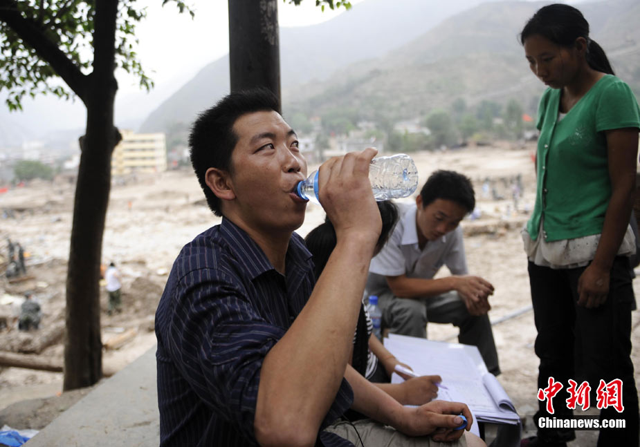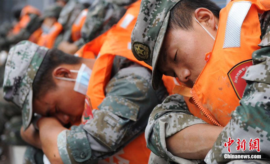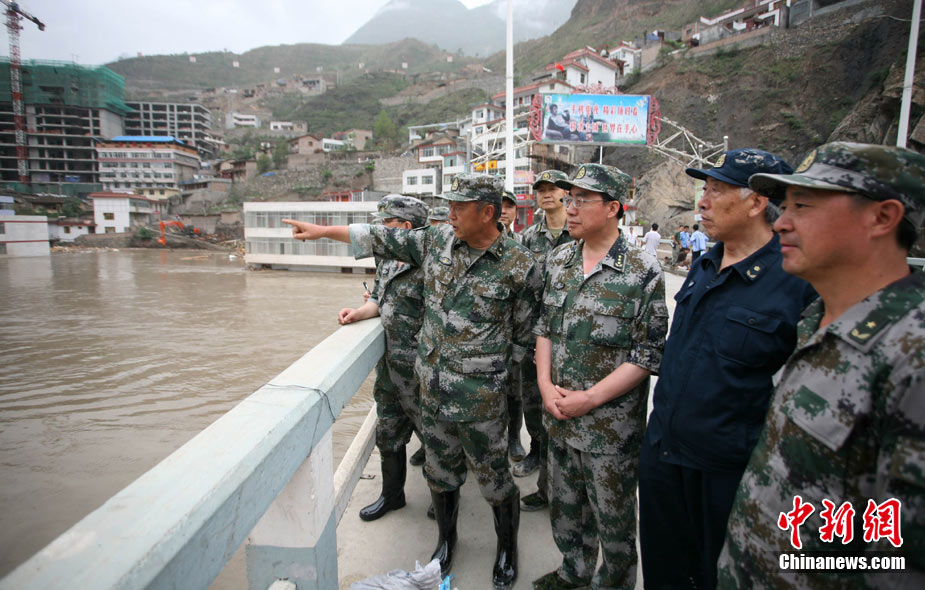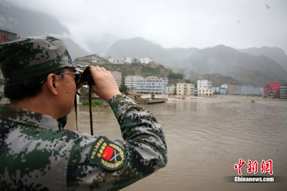 8月13日14:50分,蘭州軍區(qū)某集團軍“開山斧”工兵團已對白龍江舟曲段實施了5次爆破,疏通因泥石流等淤泥淤積堵塞的白龍江河道,在排除洪澇險情的同時,應(yīng)對今日20時前過境的新一輪洪峰。圖為觀察江面變化情況。中新社發(fā) 劉忠俊 攝