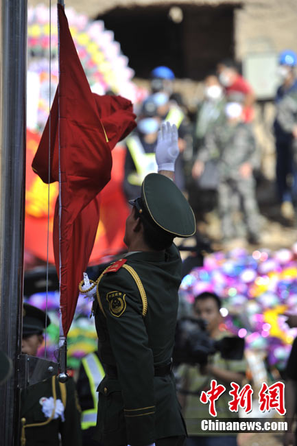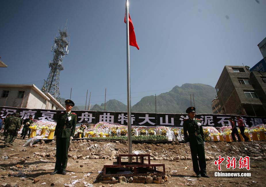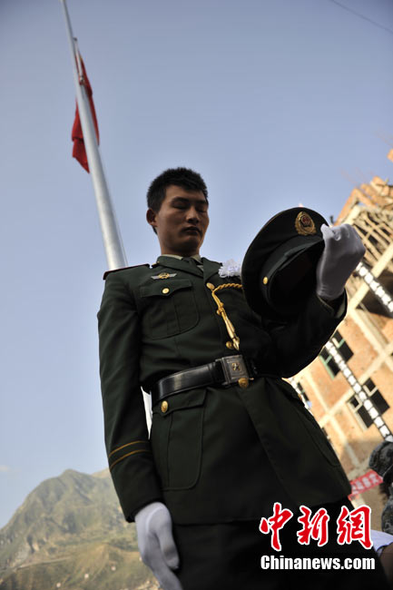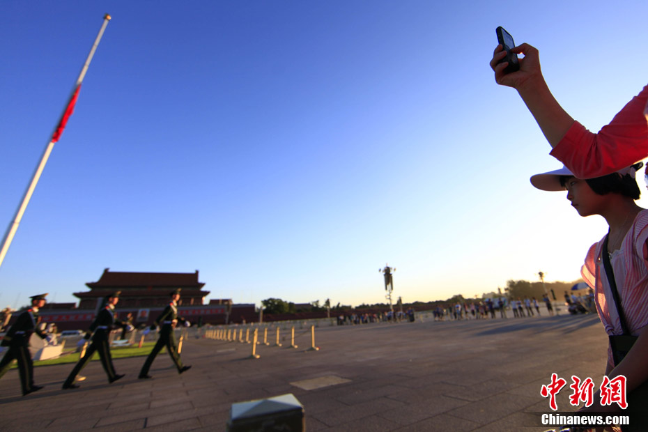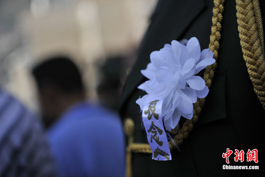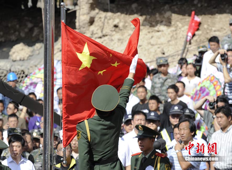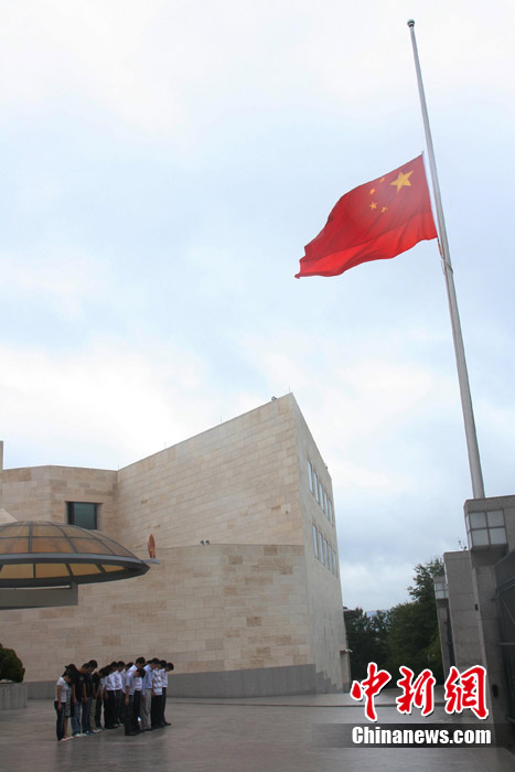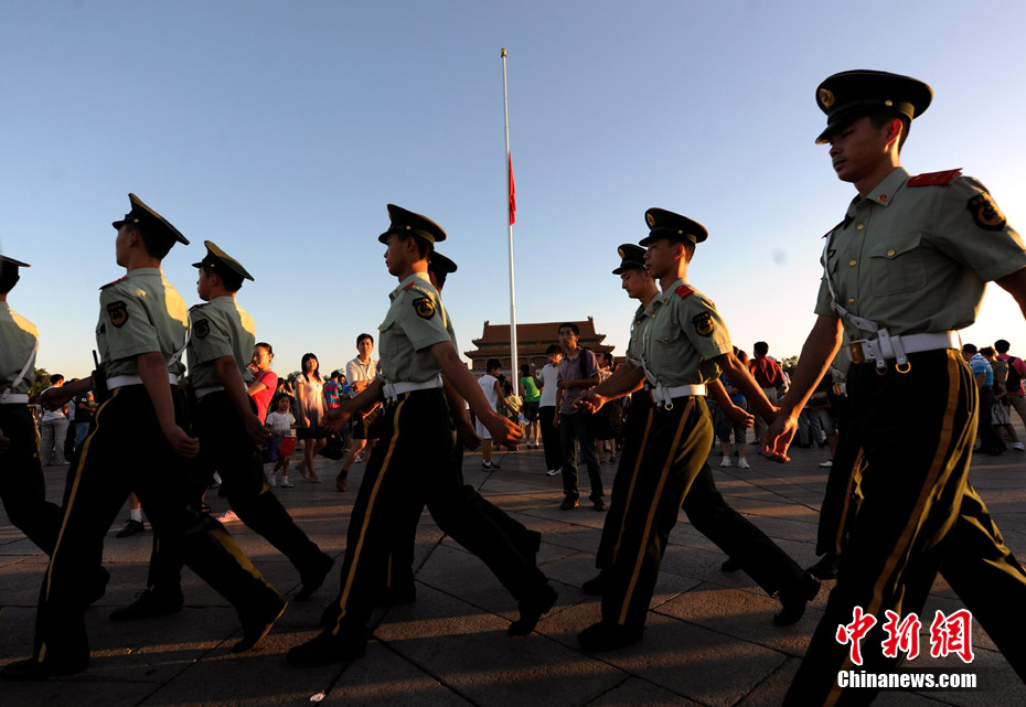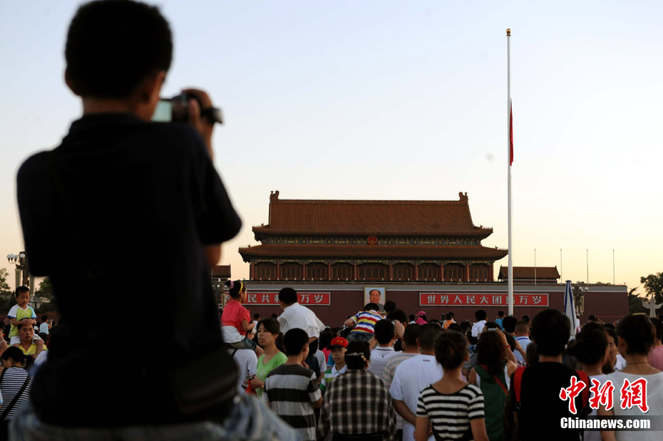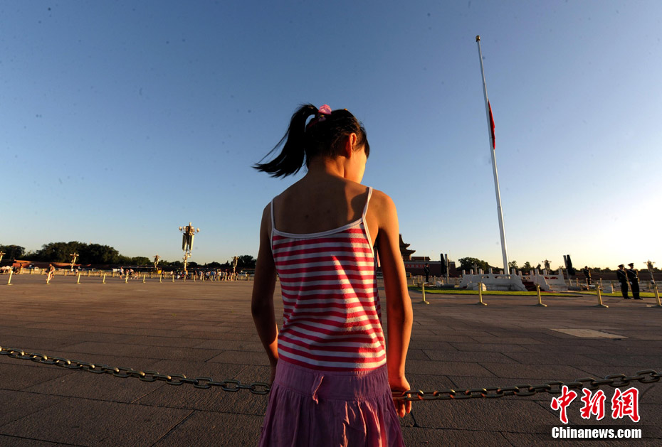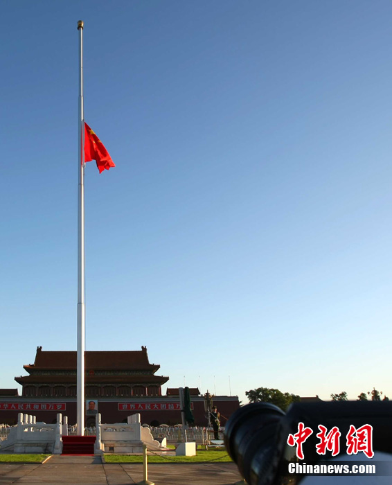 8月15日5時28分,天安門廣場下半旗,對甘肅舟曲特大山洪泥石流遇難同胞表示深切哀悼。這是繼2008年5月汶川地震和今年4月玉樹地震后,國旗第三度為普通國民而降。中新社記者 富田 攝