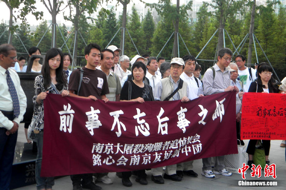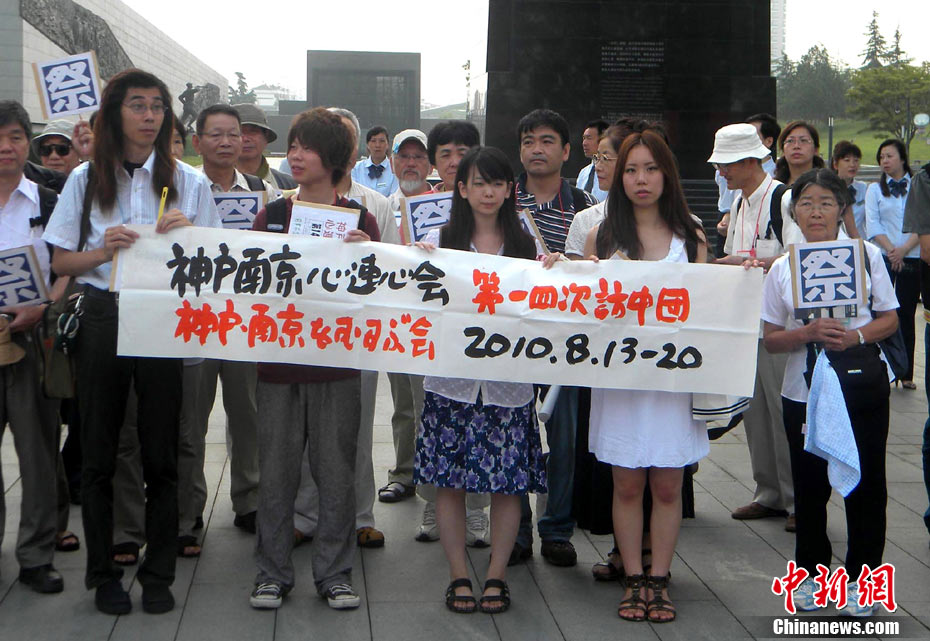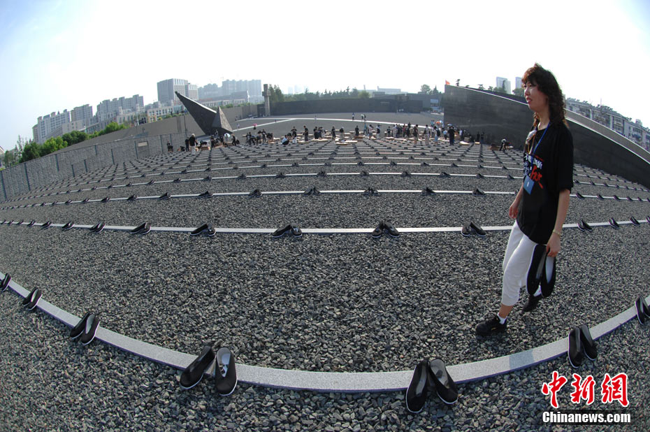 為紀(jì)念二戰(zhàn)期間在日本遇害的6830名被強(qiáng)擄的中國勞工,8月14日下午,在侵華日軍南京大屠殺遇難同胞紀(jì)念館廣場,被擄勞工中的幸存者及遇難者家屬、日本友人等近50人舉行了6830雙布鞋擺放活動。中新社發(fā) 江法 攝 圖片來源:cnsphoto