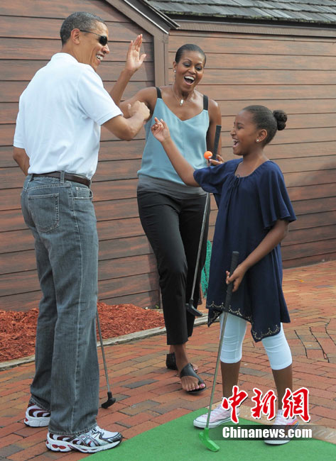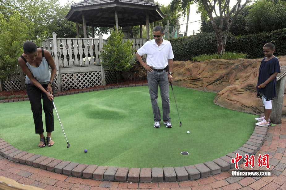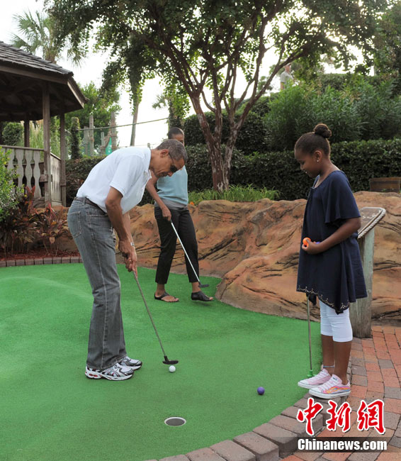 近日,奧巴馬到佛羅里達巡視墨西哥灣油污清理作業(yè)、推銷當?shù)赜^光的機會。14日,他帶著妻女到佛羅里達一個迷你高爾夫球場散心, 全家一起上陣,小試身手。
