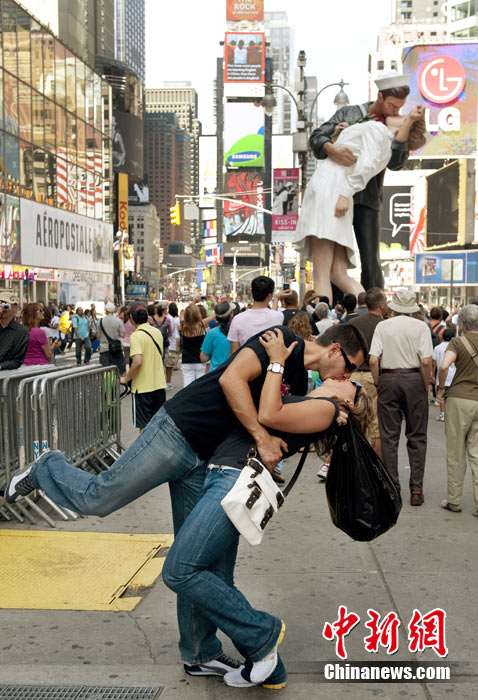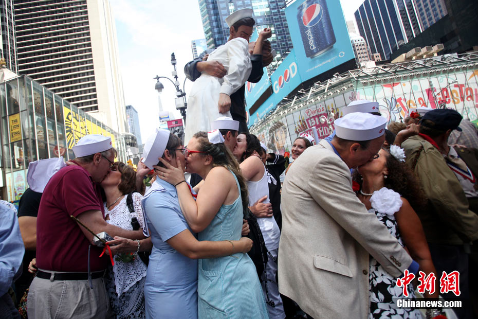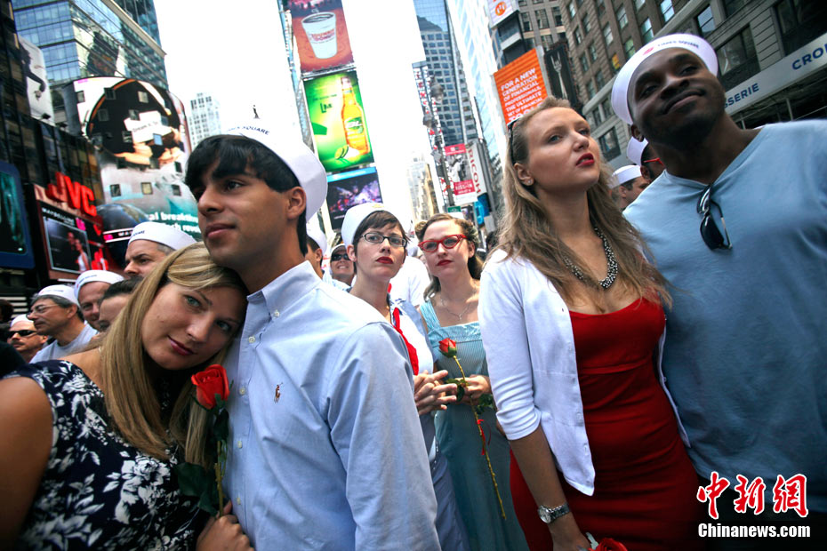 來自不同國家、不同種族的200多對情侶,14日齊聚紐約時(shí)報(bào)廣場,再現(xiàn)“勝利日之吻”的經(jīng)典瞬間,以此紀(jì)念二戰(zhàn)結(jié)束65周年。