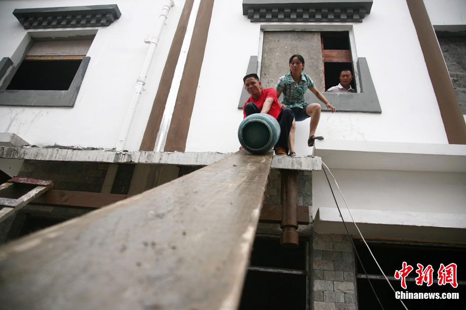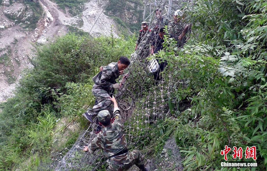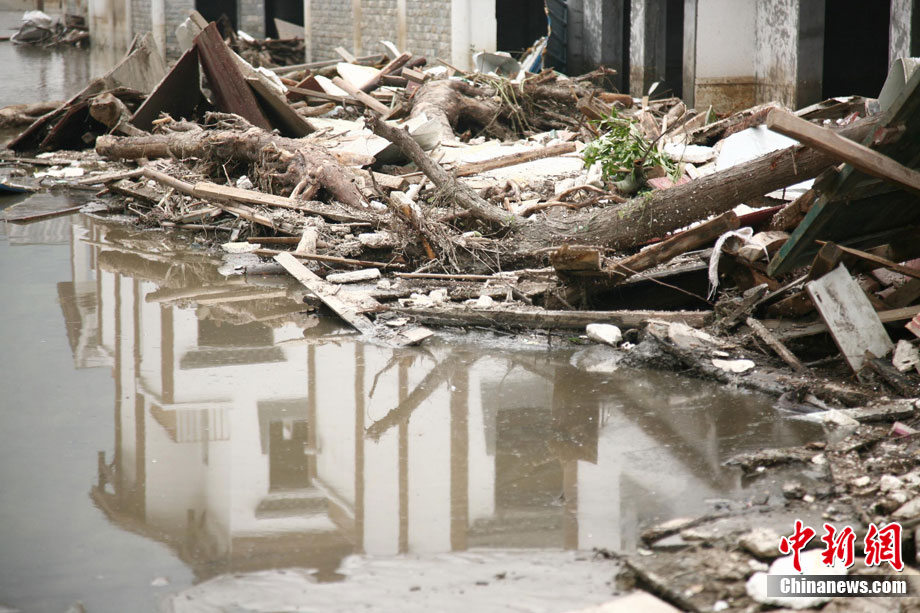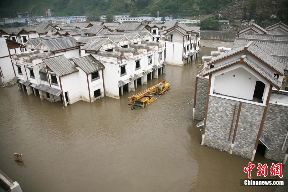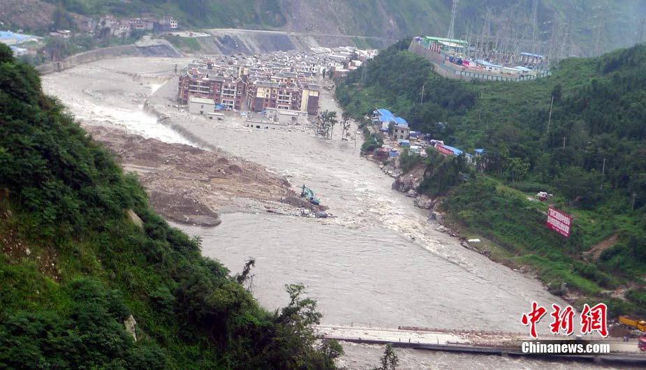 8月16日,發(fā)生泥石流災害已經兩天的四川省汶川縣映秀鎮(zhèn)新城,洪水水位略有下降,搶險人員還正全力自處置堰塞體。圖為被洪水圍困的映秀新城。中新社發(fā) 張浪 攝