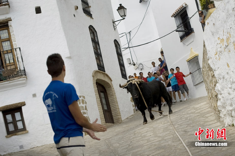 近日,西班牙羅薩里奧一個小城的居民在村中街道上玩起了斗牛。勇敢的年輕人一邊挑釁憤怒的公牛,一邊紛紛跳上房屋躲避。上演了一場街頭斗牛。
