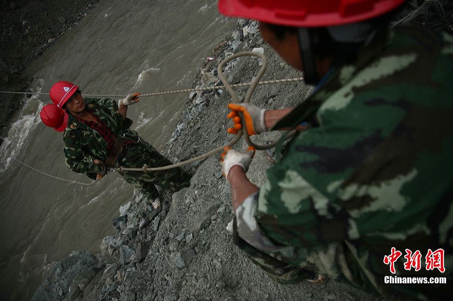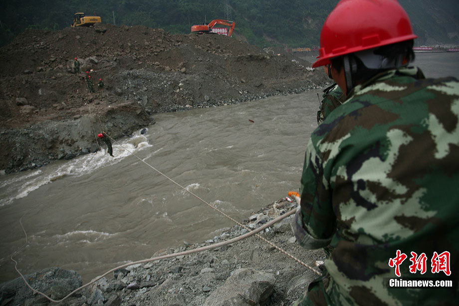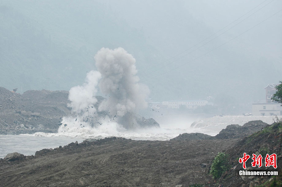 8月17日下午,映秀泥石流搶險救災指揮部對致使岷江改道的堰塞體進行了第二次爆破,由于天氣不甚理想,為了盡快實現(xiàn)岷江河水“回軌”,救援指揮部決定以爆破的方式加快搶險進度。據爆破現(xiàn)場負責人透露,此次爆破主要是為解決8塊巨石,這些巨石超出了挖掘機的負荷量,必須選擇爆破方式解決。中新社發(fā) 張浪 攝