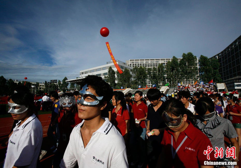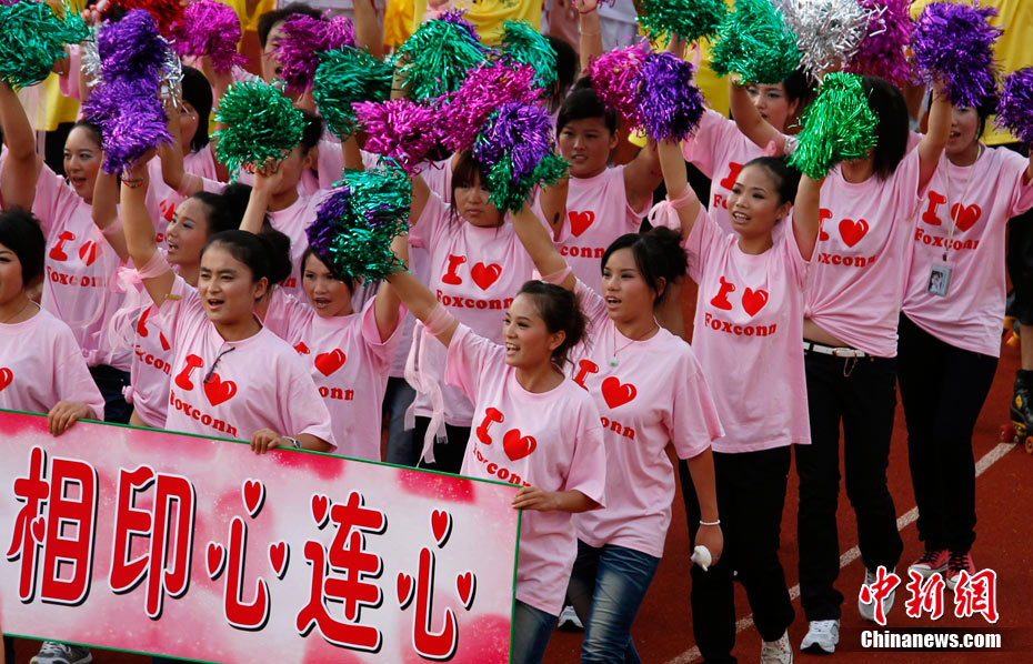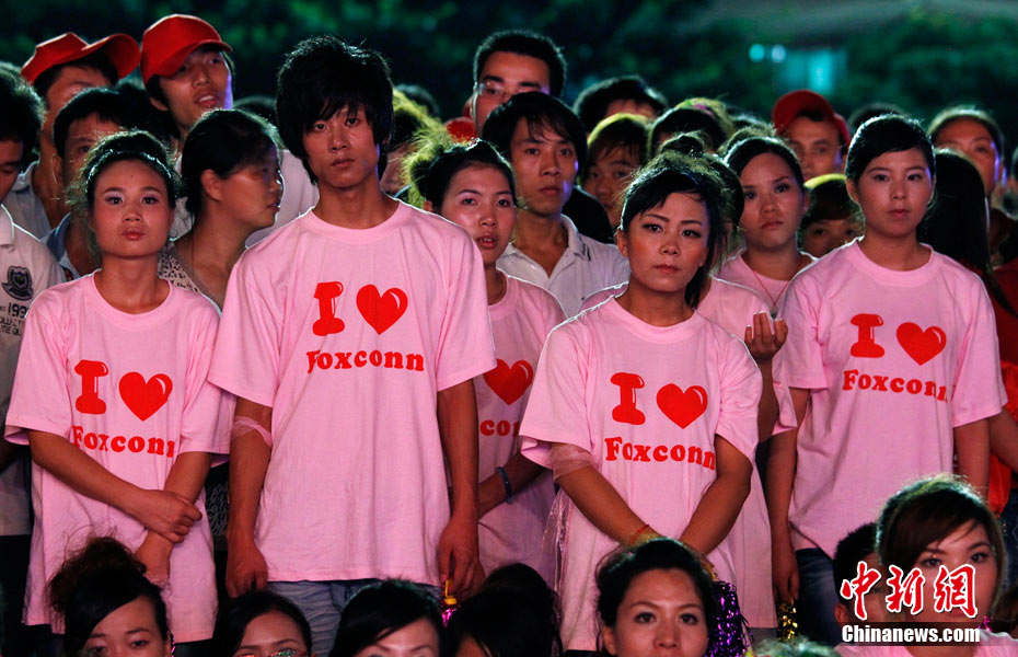 8月18日下午,深圳市富士康廠區(qū),舉行了一場由富士康員工自發(fā)倡議、富士康工會聯(lián)合會組織的規(guī)?涨暗娜f人誓師活動,活動的主題是“珍惜生命,關(guān)愛家人”,2萬員工跟著一輛輛彩車歡聲笑語,員工們說這是他們的“狂歡節(jié)”。