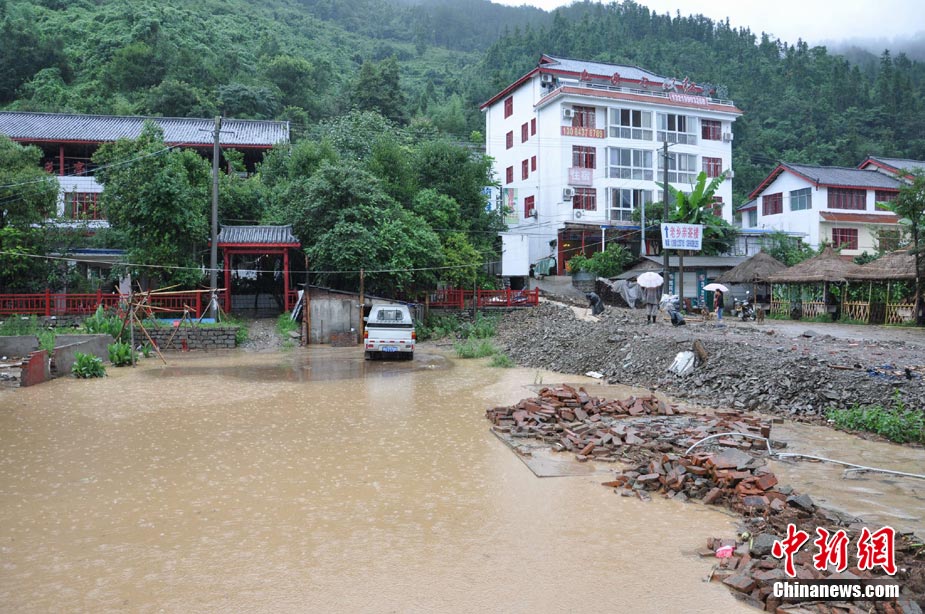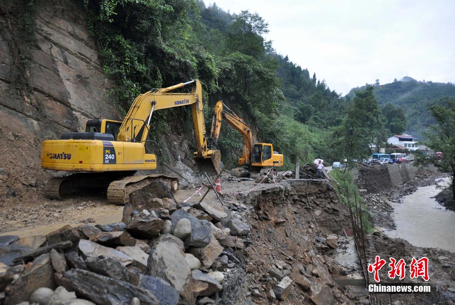 8月18日16時(shí),四川省青川縣城前往蒿溪鄉(xiāng)的道路由于暴雨造成塌方,導(dǎo)致道路中斷,車輛通行受阻,F(xiàn)場(chǎng)由于再次出現(xiàn)大量山體垮塌,部分路段搶險(xiǎn)工作被迫停止。中新社發(fā) 劉忠俊 攝