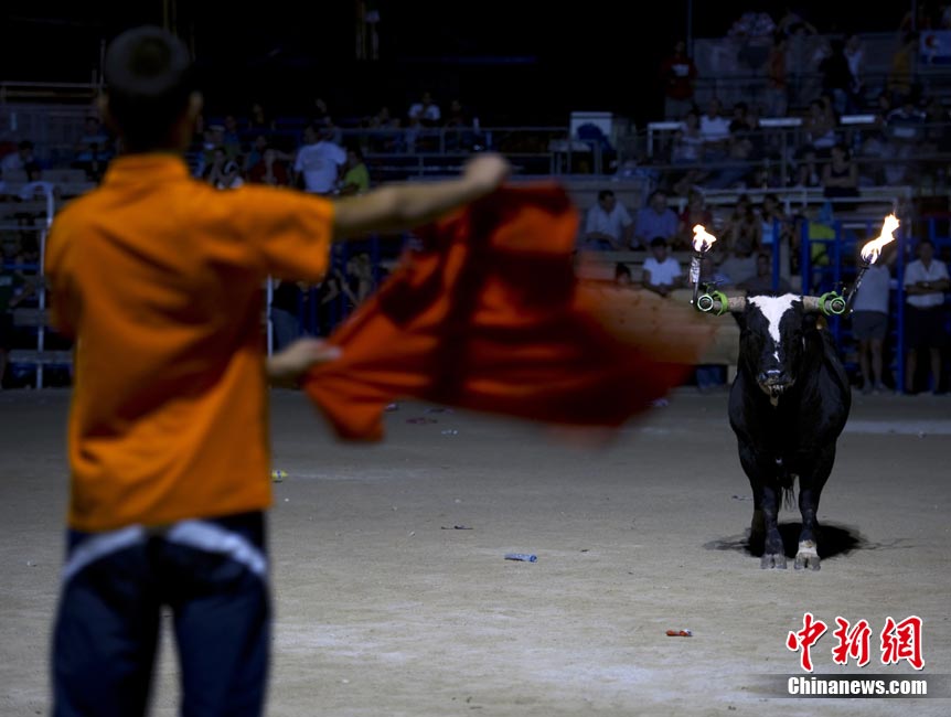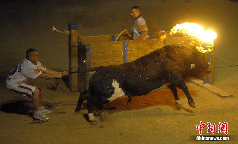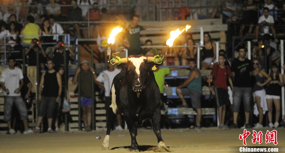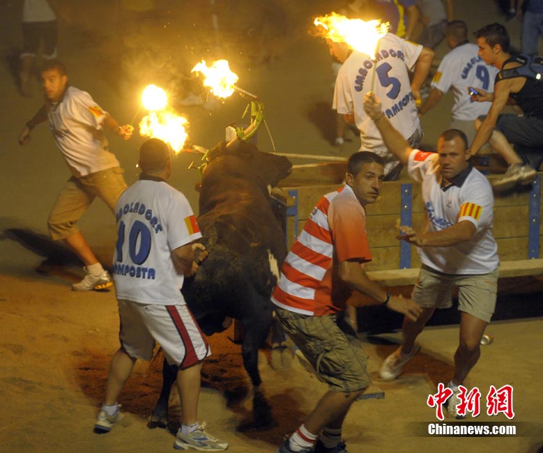 近日,在西班牙安波斯塔市,舉行“奔火!被顒(dòng)!氨蓟鹋!笔俏靼嘌罇|部地區(qū)的傳統(tǒng)節(jié)日慶典活動(dòng)。在活動(dòng)中,公牛的犄角被綁上火把滿(mǎn)場(chǎng)飛奔,場(chǎng)面驚險(xiǎn)刺激。