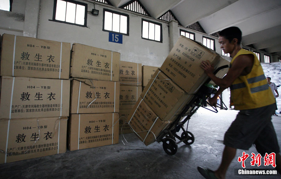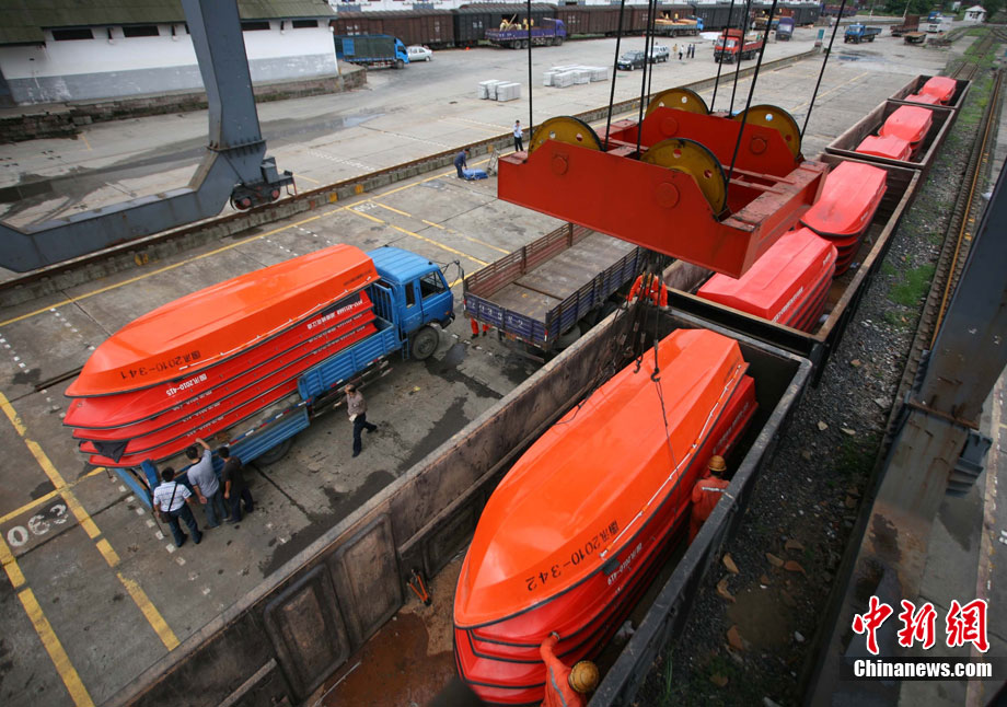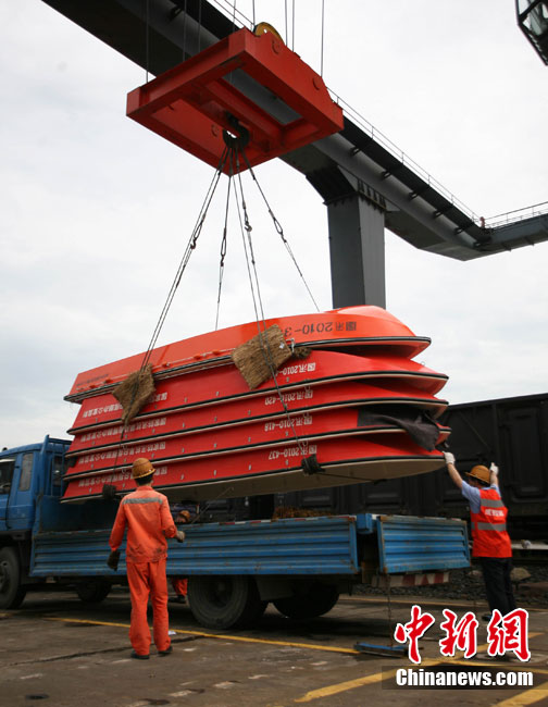 8月21日上午,國(guó)家防總緊急調(diào)撥的80艘沖鋒舟,40支橡皮舟、120臺(tái)船外機(jī)、1萬(wàn)件救生衣、4000片鉛絲籠網(wǎng)片、4000個(gè)鋼絲網(wǎng)兜、500盞查險(xiǎn)燈等搶險(xiǎn)救災(zāi)物資順利抵達(dá)成都火車東站,將立刻分發(fā)運(yùn)往成都、眉山、樂(lè)山、巴中等災(zāi)情嚴(yán)重地區(qū)。圖為裝卸工人正在吊裝沖鋒舟。中新社發(fā) 劉忠俊 攝