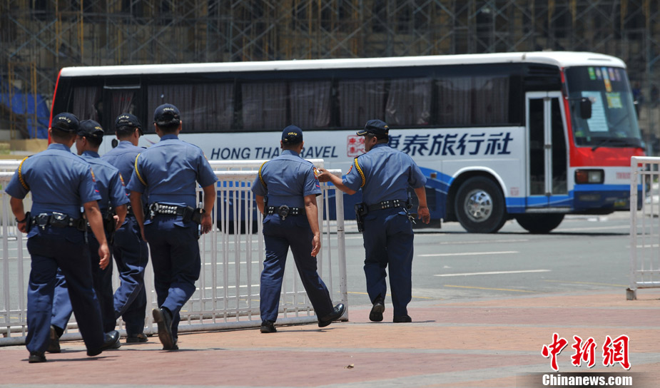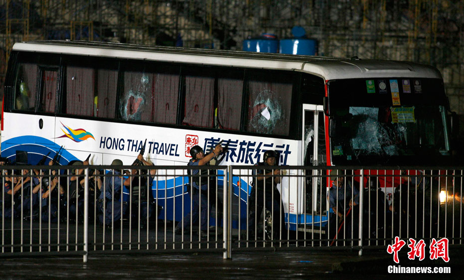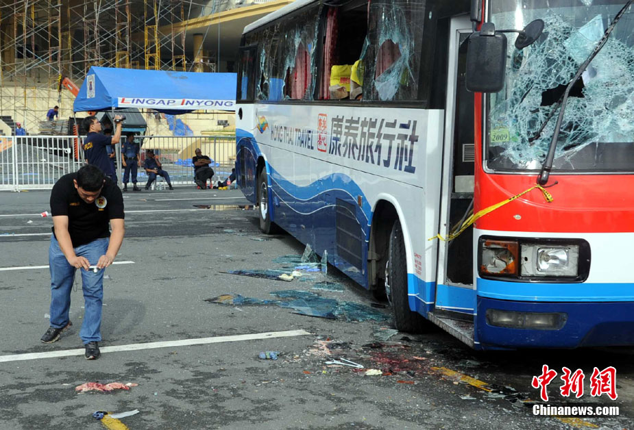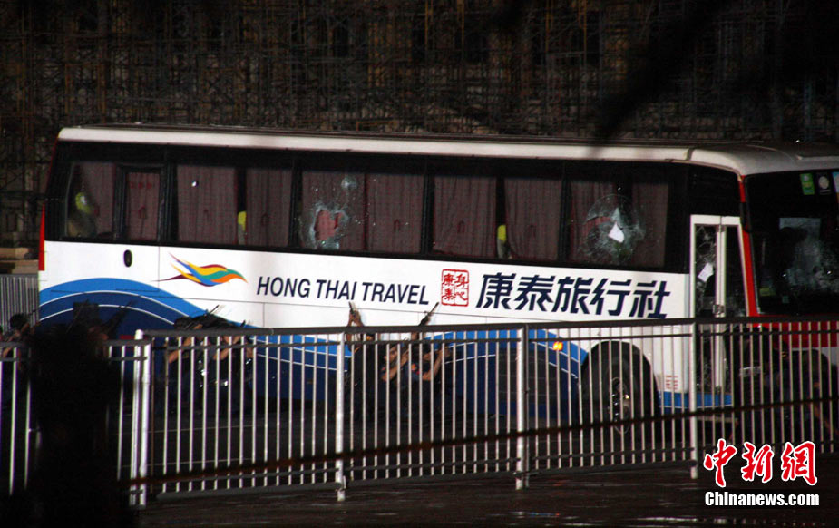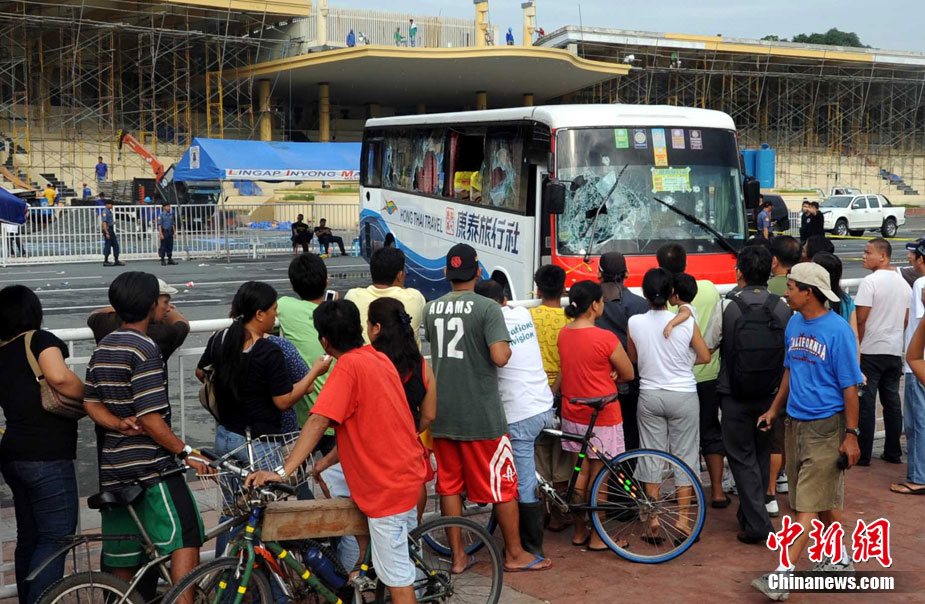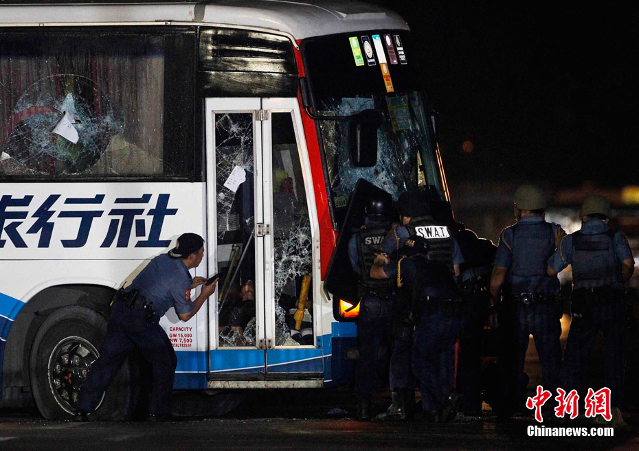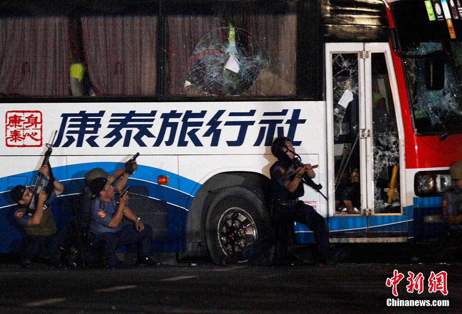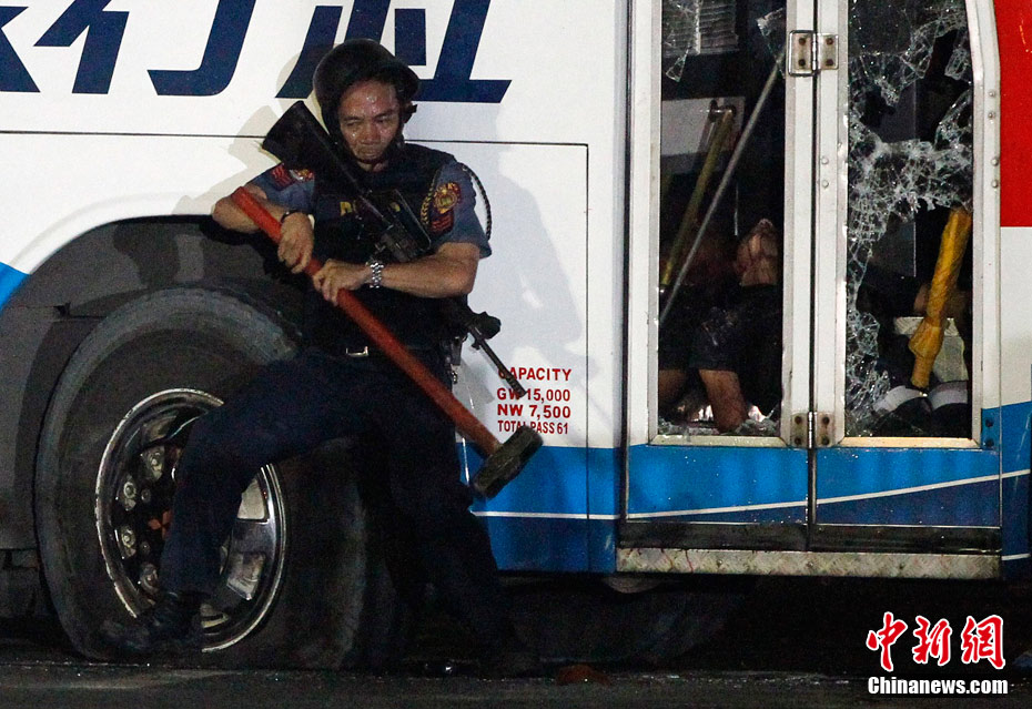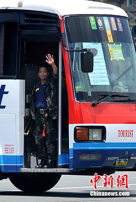 香港康泰旅行社23日證實(shí),一個(gè)21人的香港旅行團(tuán)在菲律賓馬尼拉被劫持。旅行團(tuán)包括20名香港游客和1名香港領(lǐng)隊(duì),其中有3名兒童。劫持者是一位被革職的警察。截止目前已有6名人質(zhì)獲釋,其中包括3名兒童。圖為劫持者站在被劫持的旅游觀光車門口。