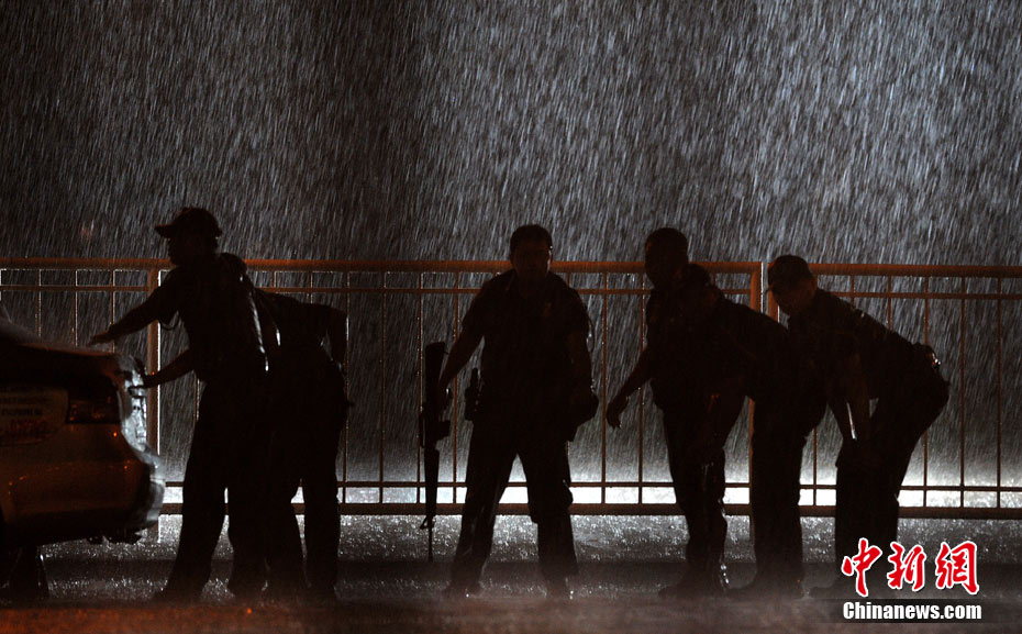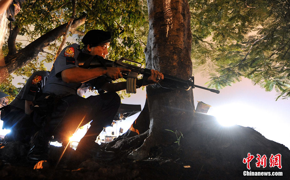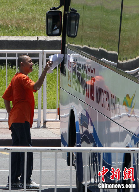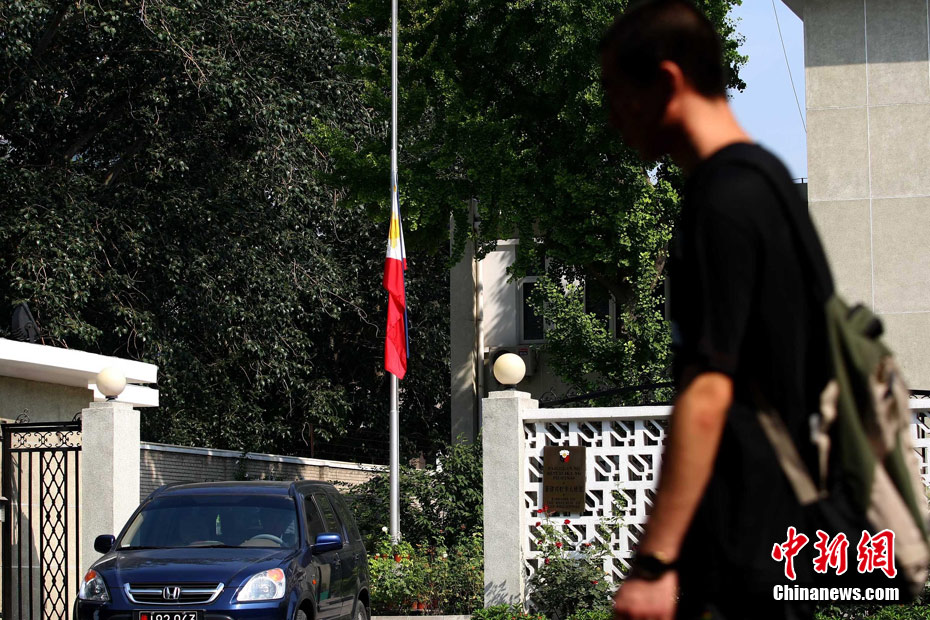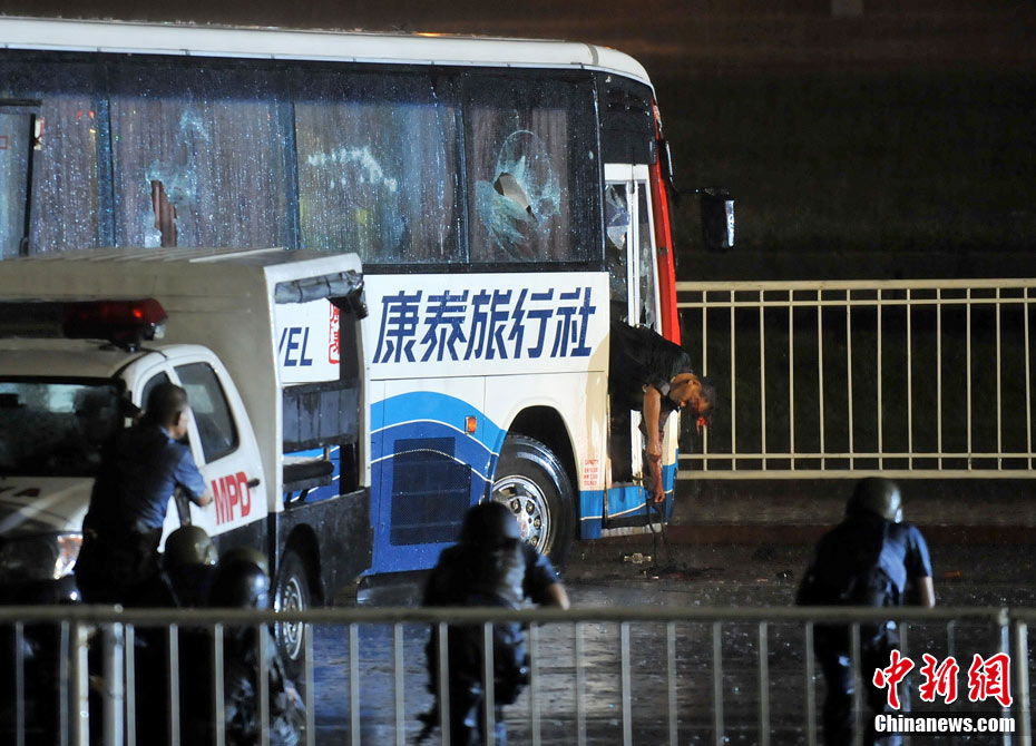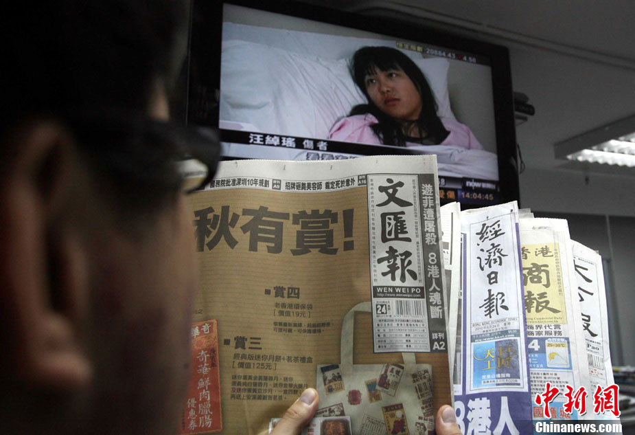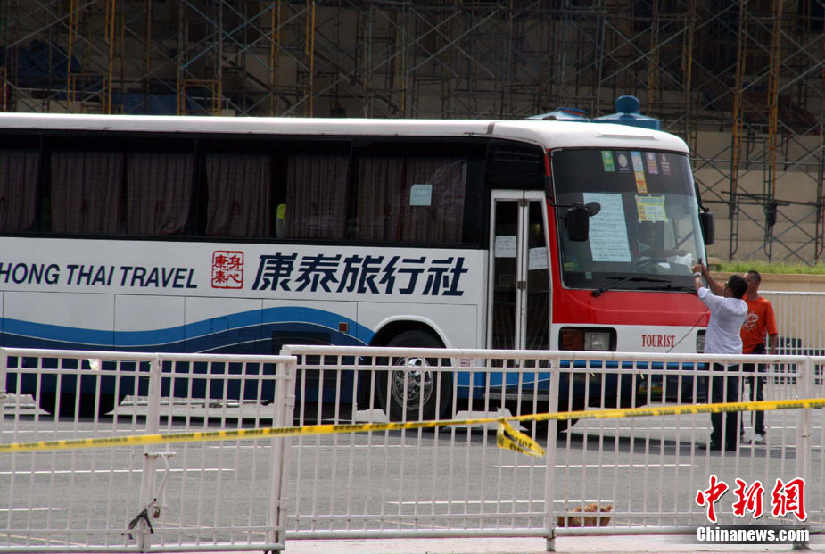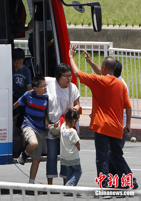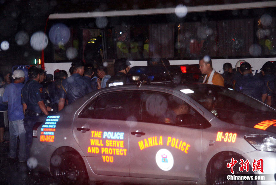 香港康泰旅行社23日證實(shí),一個(gè)21人的香港旅行團(tuán)在菲律賓馬尼拉被劫持。旅行團(tuán)包括20名香港游客和1名香港領(lǐng)隊(duì),其中有3名兒童。劫持者是一位被革職的警察。截止目前已有6名人質(zhì)獲釋,其中包括3名兒童。圖為劫持者站在被劫持的旅游觀光車門口。