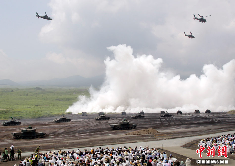 日本陸上自衛(wèi)隊(duì)24日開(kāi)始在富士山下的靜岡縣御殿場(chǎng)市東富士演習(xí)場(chǎng)舉行2010年綜合火力演習(xí)。當(dāng)天的演習(xí)動(dòng)用了90式坦克、“阿帕奇”直升機(jī)等武器。2000多名官兵參加演習(xí)。