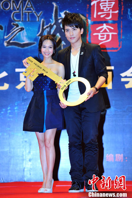 8月25日,電影《芳香之城傳奇》在北京舉行記者會。不老的“紫霞仙子”朱茵攜主演扎西頓珠、張達明、李子雄、張璇、董立范等亮相。朱茵以一襲抹胸短裙亮相,自曝在新片中大轉(zhuǎn)型,飾演一個有天然體香的神秘啞女,男主角扎西頓珠飾演的“富二代”被其吸引后,上演了一段純美姐弟戀。朱茵在接受采訪時坦言自己并不拒絕姐弟戀。圖為朱茵、扎西頓珠現(xiàn)場秀親昵。中新社記者 李學仕 攝