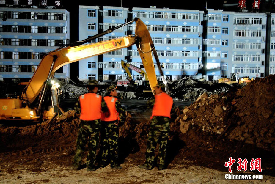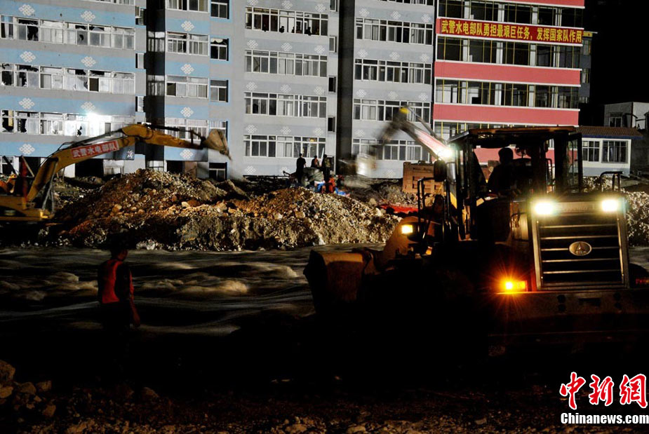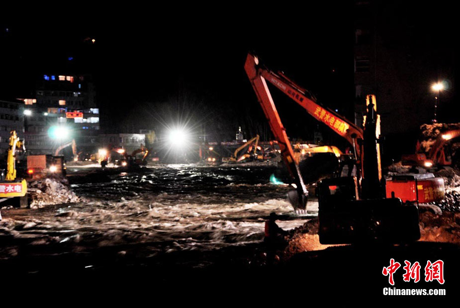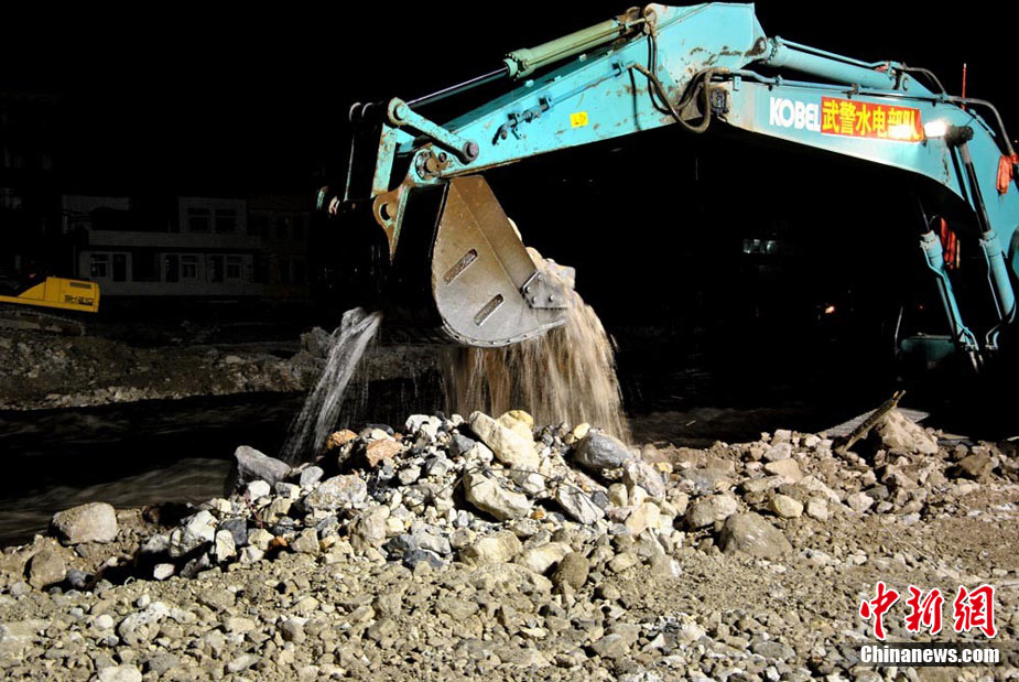 為盡快消除舟曲特大泥石流形成的白龍江堰塞體,疏通河道,早日解除舟曲縣城水患,武警水電部隊(duì)官兵日夜艱苦奮戰(zhàn)在在1.5公里的白龍江兩岸搶險(xiǎn)一線, 24小時(shí)晝夜挖掘和清理河道中的碎石淤泥,到目前水位下降已3米多 縣城淹沒(méi)房屋逐退水面。白龍江堰塞體搶險(xiǎn)工作已全面進(jìn)入沖刺階段,圖為8月26日晚11時(shí)左右武警水電部隊(duì)官兵夜戰(zhàn)白龍江的施工現(xiàn)場(chǎng)。中新社記者 侯志紅 攝